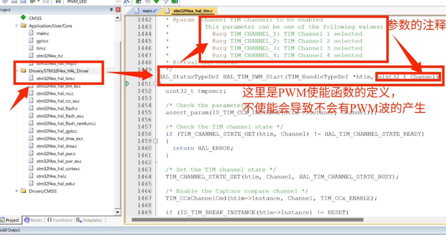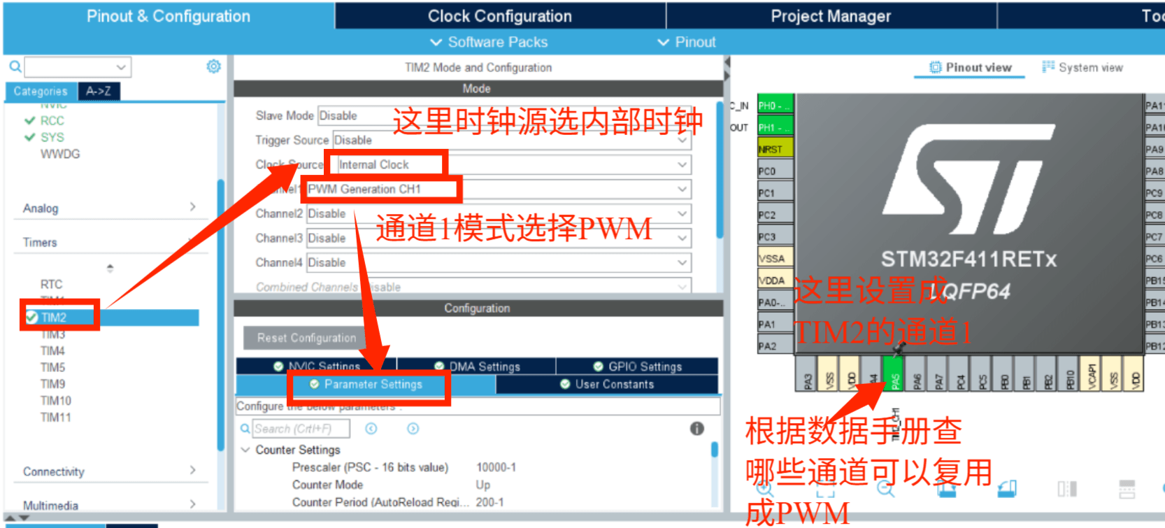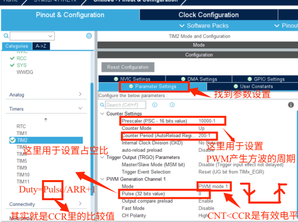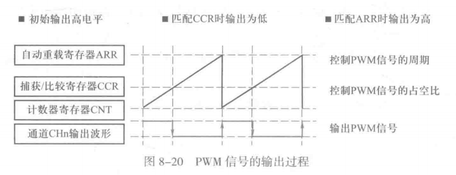 要实现PWM信号的输出,需要用到三个寄存器:自动重载寄存器TIMx_ARR,捕获/ 比较寄存器TIMx_CCRn)以及计数器寄存器TIMx_CNT,并通过通道引脚TIMx_CHn输出PWM信号。