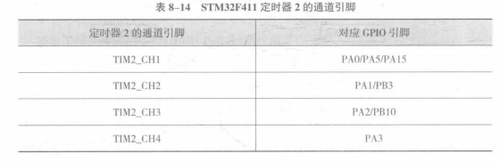 通道引脚所对应的GPIO引脚,可以查阅芯片的参考手册获取。以STM32F411芯片的定时器2为例,其四个通道引脚所对应的GPI0引脚如表所示。