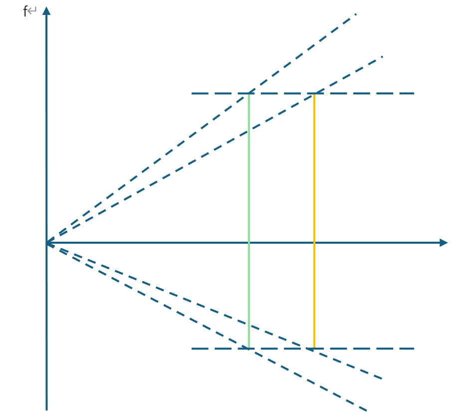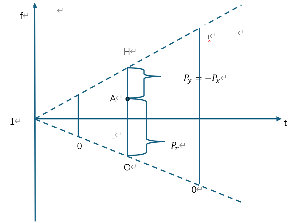 既然在横轴特定点上对应的纵轴上的长度,意味着虚数单位i的大小,那么由这些虚数单位和其倒数的频点构成的张角的大小本身就意味着虚数单位随着时间增长而增长的速率(快慢)。进而可以推导出,不同的张角就意味着不同的增长速率。张角越大,虚数单位随着时间增长的速率越大,同样的时间间隔,张角大的虚数单位的数量增长更多。这也意味着,在时间的方向上,张角较大的,会更早扩展到张角小的对应的虚数单位将会扩展到的范围:图中的绿线在时间方向上先于橙线出现。当然这也意味着,时间轴上的过去现在和未来都是同时存在的。