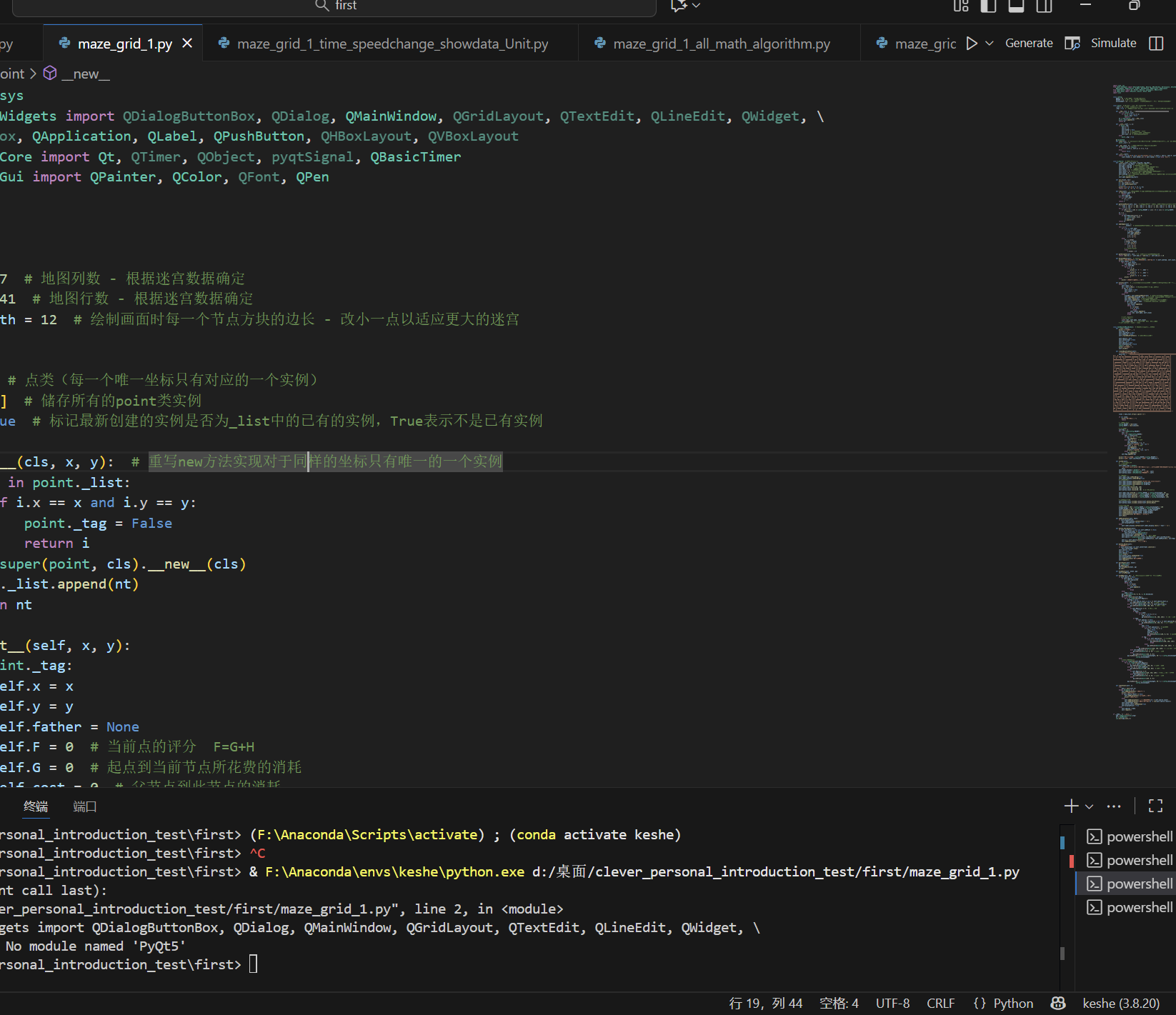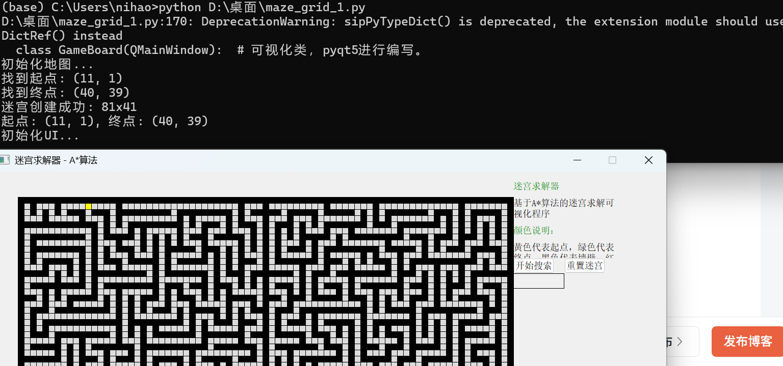 #################################################################################"""lines = maze_text.strip().split('\n')if not lines:print("迷宫数据为空")return# 设置地图尺寸config.HEIGHT = len(lines)config.WIDTH = len(lines[0])# 初始化地图self.Map = []for i in range(config.HEIGHT):row = []for j in range(config.WIDTH):char = lines[i][j]if char == '#': # 墙壁row.append(1)elif char == '$': # 起点row.append(0)self.startPoint = (j, i)print(f"找到起点: ({j}, {i})")elif char == '@': # 终点row.append(0)self.endPoint = (j, i)print(f"找到终点: ({j}, {i})")else: # 可通行的路径row.append(0)self.Map.append(row)print(f"迷宫创建成功: {config.WIDTH}x{config.HEIGHT}")print(f"起点: {self.startPoint}, 终点: {self.endPoint}")def initUI(self):# 开始初始化UI部分# 创建UI控件self.label_tips = QLabel("<p style='color:green'>迷宫求解器</p>基于A*算法的迷宫求解可视化程序\n<p style='color:green'>颜色说明:</p>\n黄色代表起点,绿色代表终点,黑色代表墙壁,红色代表待搜索的open列表,灰色代表已搜索过的close列表,蓝色代表当前搜索到的路径",self)self.label_display = QLabel("", self)self.button_start = QPushButton("开始搜索", self)self.button_reset = QPushButton("重置迷宫", self)# 设置控件属性self.label_tips.setWordWrap(True)self.label_display.setWordWrap(True)# 设置控件样式self.label_display.setStyleSheet("border:1px solid black")self.label_display.setAlignment(Qt.AlignLeft)self.label_display.setAlignment(Qt.AlignTop)# 设置控件的尺寸和位置self.label_tips.resize(200, 150)self.button_start.resize(80, 30)self.button_reset.resize(80, 30) # 修复这里的笔误self.label_tips.move(50 + (config.WIDTH) * config.blockLength, 20)self.label_display.move(50 + (config.WIDTH) * config.blockLength, 200)self.button_start.move(50 + (config.WIDTH) * config.blockLength, 170)self.button_reset.move(150 + (config.WIDTH) * config.blockLength, 170)# 给控件绑定事件self.button_start.clicked.connect(self.button_StartEvent)self.button_reset.clicked.connect(self.button_Reset)# UI初始化完成window_width = 100 + (config.WIDTH * config.blockLength) + 250window_height = 100 + (config.HEIGHT * config.blockLength)self.setGeometry(100, 100, window_width, window_height)self.setMinimumSize(window_width, window_height)self.setMaximumSize(window_width, window_height)self.setWindowTitle('迷宫求解器 - A*算法')self.show()def addDisplayText(self, text):if self.displayFlush:self.label_display.setText(text + '\n')self.displayFlush = Falseelse:self.label_display.setText(self.label_display.text() + text + '\n')def button_StartEvent(self):if self.startPoint != None and self.endPoint != None:if self.centerTimer == None:self.centerTimer = QBasicTimer()self.button_start.setEnabled(False)self.centerTimer.start(30, self) # 加快动画速度self.search = A_Search(point(self.startPoint[1], self.startPoint[0]),point(self.endPoint[1], self.endPoint[0]), self.Map)self.yi = self.search.process()self.addDisplayText('开始进行搜索')def button_Reset(self):"""重置迷宫"""if self.centerTimer and self.centerTimer.isActive():self.centerTimer.stop()self.search = Noneself.yi = Noneself.special = Nonepoint.clear()self.button_start.setEnabled(True)self.displayFlush = Trueself.addDisplayText('迷宫已重置')self.repaint()def paintEvent(self, event):qp = QPainter()qp.begin(self)self.drawBoard(event, qp)qp.end()def drawBoard(self, event, qp):self.drawMap(qp)def drawMap(self, qp): # 画面绘制方法,每次地图有所改动都将重绘if self.search != None:if self.special != None:e = self.special[0]path = [e]while True:e = e.fatherif e != None:path.append(e)else:breakelse:path = Nonepen = QPen(QColor(0, 0, 0), 1, Qt.SolidLine)qp.setPen(pen)for i in range(len(self.Map)):for j in range(len(self.Map[i])):wordTag = Falseif i == self.search.start.x and j == self.search.start.y:qp.setBrush(QColor(255, 255, 0)) # 起点 - 黄色elif i == self.search.end.x and j == self.search.end.y:qp.setBrush(QColor(100, 200, 50)) # 终点 - 绿色else:if self.Map[i][j] == 0: # 可通行路径tagx = Trueif path:for k in path:if k.x == i and k.y == j:tagx = Falseqp.setBrush(QColor(0, 100, 255)) # 路径 - 蓝色if tagx:if self.special != None:if i == self.special[0].x and j == self.special[0].y:qp.setBrush(QColor(0, 255, 0)) # 当前搜索点 - 绿色else:tag = Truefor k in self.special[1]: # open列表if k.x == i and k.y == j:tag = FalsewordTag = Trueword = str(k.F)qp.setBrush(QColor(150, 0, 0)) # open列表 - 红色breakif tag:for k in self.special[2]: # close列表if k.x == i and k.y == j:qp.setBrush(QColor(150, 150, 150)) # close列表 - 灰色breakelse:qp.setBrush(QColor(220, 220, 220)) # 空白路径 - 浅灰色else:qp.setBrush(QColor(220, 220, 220)) # 空白路径 - 浅灰色elif self.Map[i][j] == 1: # 墙壁qp.setBrush(QColor(0, 0, 0)) # 墙壁 - 黑色else:qp.setBrush(QColor(255, 0, 0))qp.drawRect(50 + j * config.blockLength, 50 + i * config.blockLength, config.blockLength,config.blockLength)else:# 没有搜索时的绘制for i in range(len(self.Map)):for j in range(len(self.Map[i])):if (j, i) == self.startPoint:qp.setBrush(QColor(255, 255, 0)) # 起点 - 黄色elif (j, i) == self.endPoint:qp.setBrush(QColor(100, 200, 50)) # 终点 - 绿色else:if self.Map[i][j] == 0:qp.setBrush(QColor(220, 220, 220)) # 可通行路径 - 浅灰色elif self.Map[i][j] == 1:qp.setBrush(QColor(0, 0, 0)) # 墙壁 - 黑色else:qp.setBrush(QColor(255, 0, 0))qp.drawRect(50 + j * config.blockLength, 50 + i * config.blockLength, config.blockLength,config.blockLength)def timerEvent(self, e):try:data = next(self.yi)except Exception as e:self.addDisplayText('搜索结束:')print('搜索结束!')if self.search.result == None:self.addDisplayText('未找到可行路径')print('搜索结束!')else:self.addDisplayText('总计搜索节点数:%d' % self.search.count)self.addDisplayText('最终路径长度:%d' % len(self.search.result))self.centerTimer.stop()sel