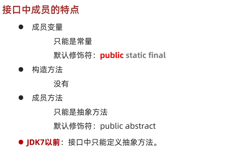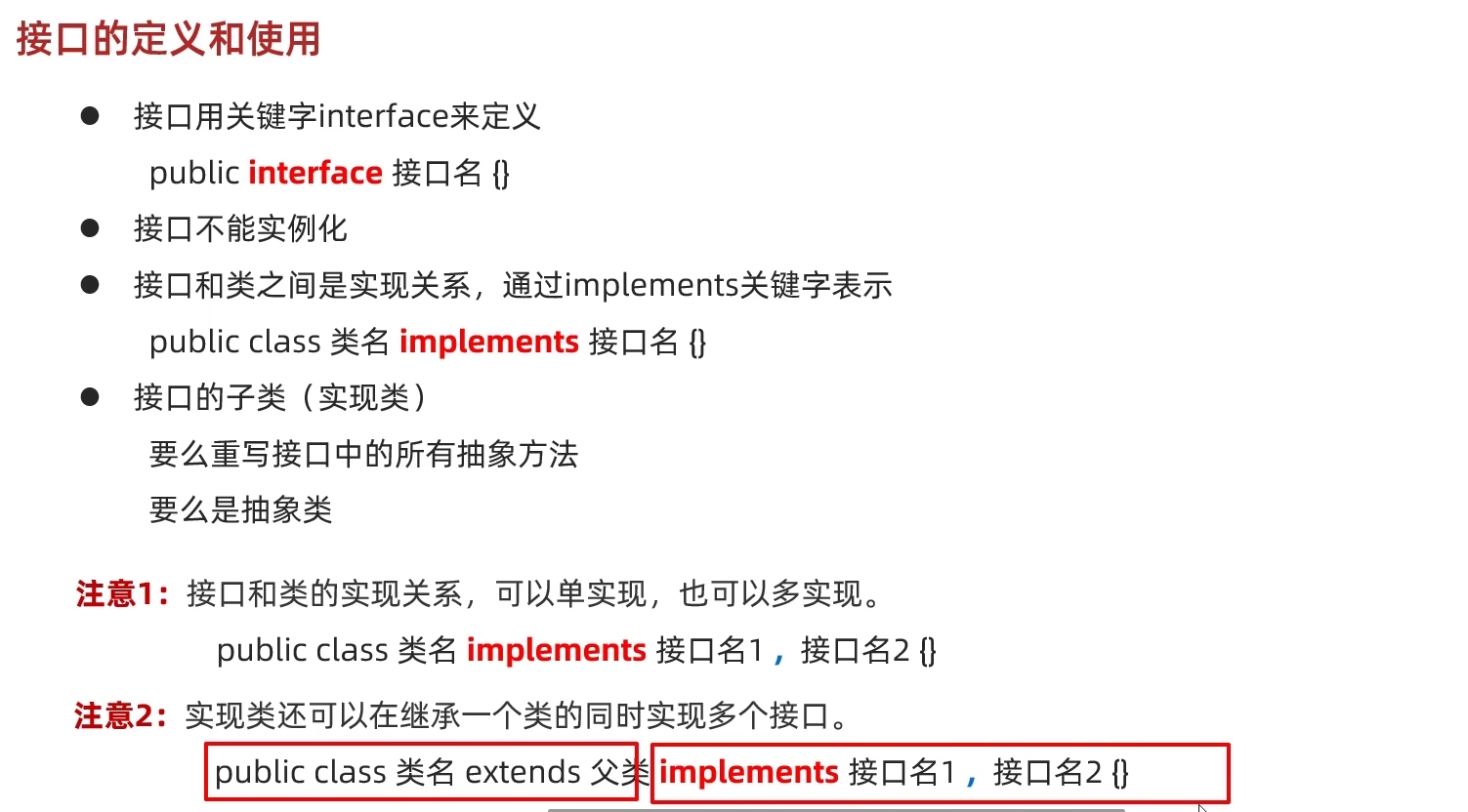 package com.interfaceapp.demo2;public interface Inter {public static final int a=10;//接口里面只能有常量,且该常量所有地方都能使用,用接口.常量名调用public abstract void method();}