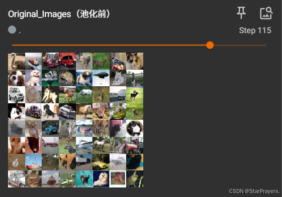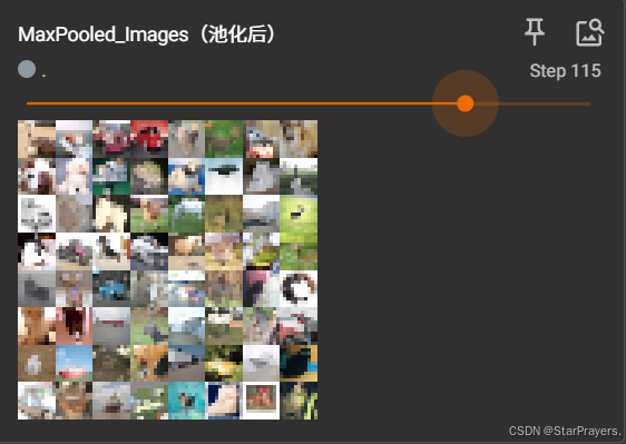 for data in dataloader:imgs, targets = data # imgs形状:[64, 3, 32, 32]# 写入原始图像writer.add_images("Original_Images(池化前)", imgs, step)# 执行最大池化output = prayer(imgs) # output形状:[64, 3, 11, 11]# 写入池化后的图像writer.add_images("MaxPooled_Images(池化后)", output, step)step += 1writer.close()