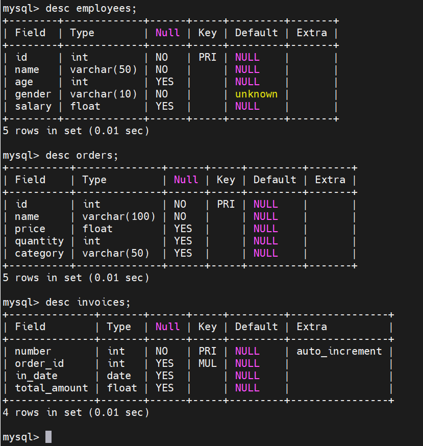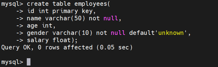 mysql> create table employees(-> id int primary key,-> name varchar(50) not null,-> age int,-> gender varchar(10) not null default'unknown',-> salary float);
