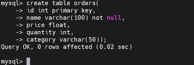 mysql> create table orders(-> id int primary key,-> name varchar(100) not null,-> price float,-> quantity int,-> category varchar(50));
