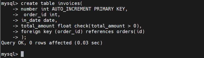 mysql> create table invoices(-> number int AUTO_INCREMENT PRIMARY KEY,-> order_id int,-> in_date date,-> total_amount float check(total_amount > 0),-> foreign key (order_id) references orders(id)-> );