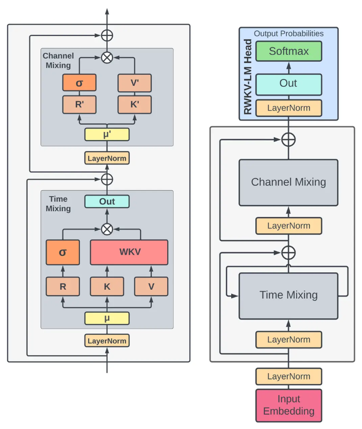 RWKV结合了循环神经网络(RNN)和Transformer的优点,旨在提高模型的效率和性能。RWKV架构主要包括以下几个关键部分:输入嵌入(Input Embedding)、时间混合(Time Mixing)、通道混合(Channel Mixing)和RWKV-LM头部(RWKV-LM Head)。
