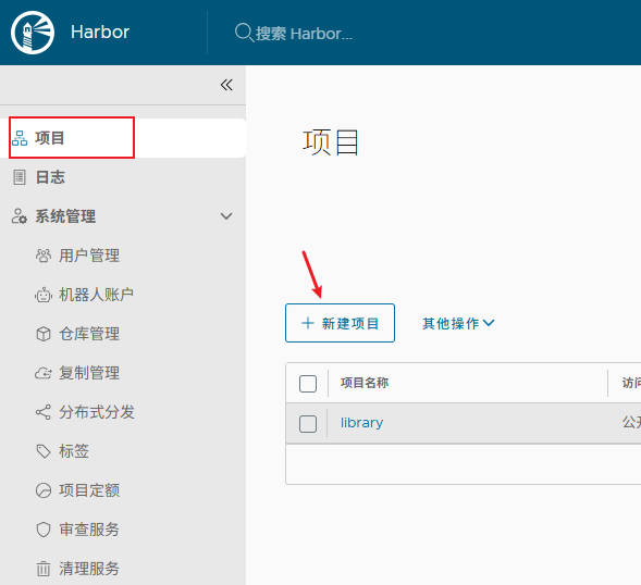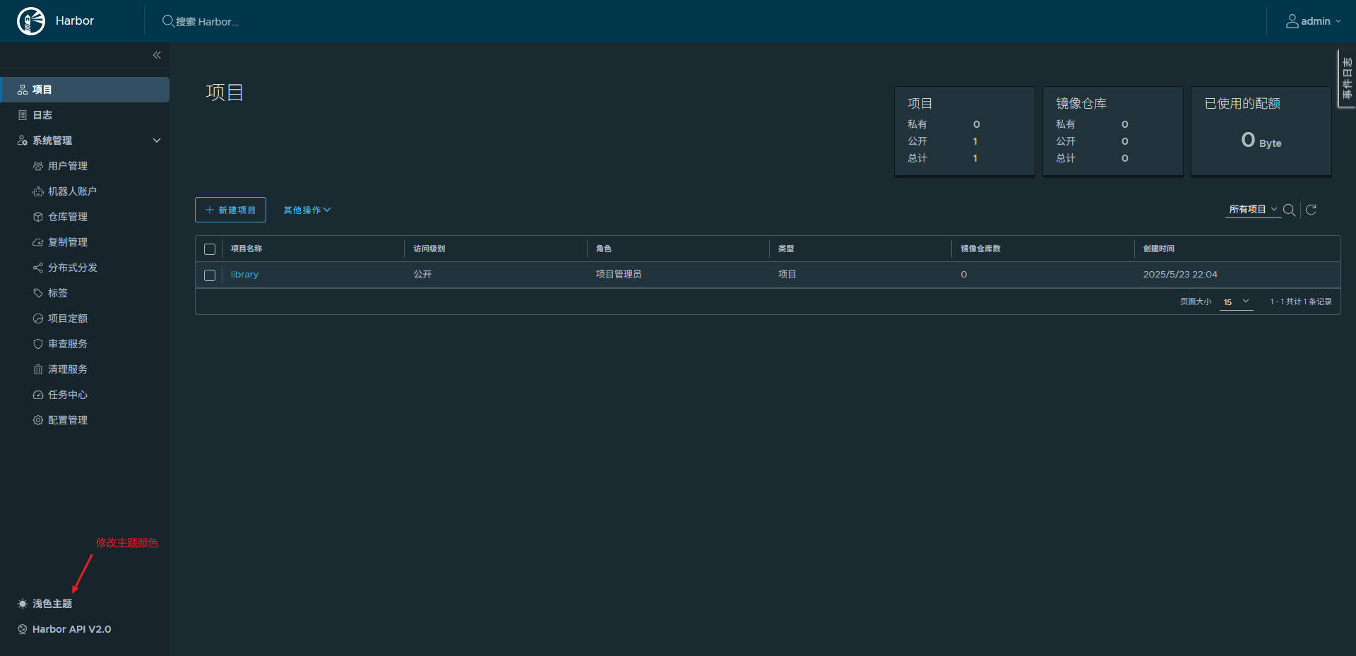 账号为:admin,密码为:Harbor12345。登录成功页面如下,强烈建议及时修改管理员账号密码