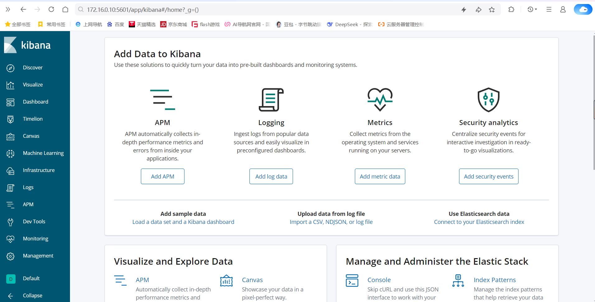 # 启动kibana服务并设置开机自启 systemctl start kibana.service systemctl enable kibana.service # 查看5601端口是否监听 netstat -natp | grep 5601 # 浏览器访问验证 http://172.16.0.10:5601