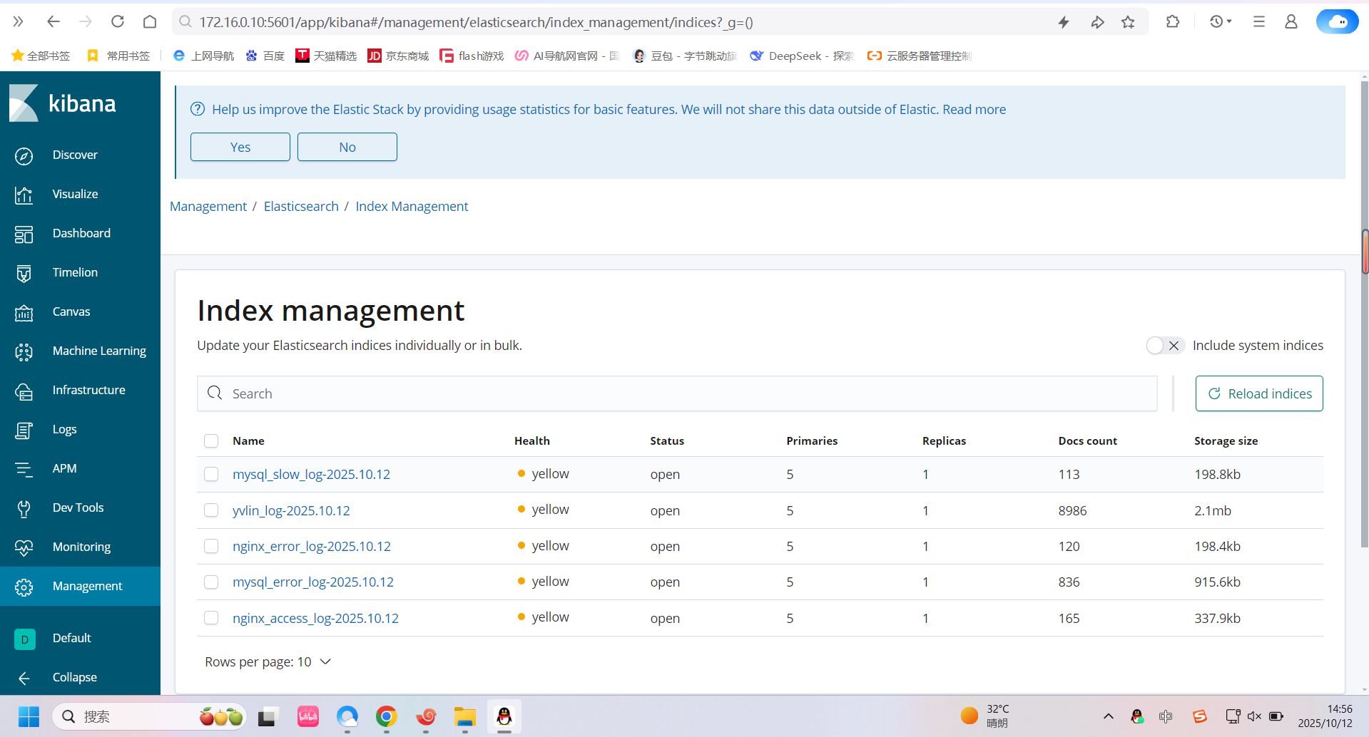 进入 kibana 界面,通过Index Management可查看已收集的日志索引,包括: