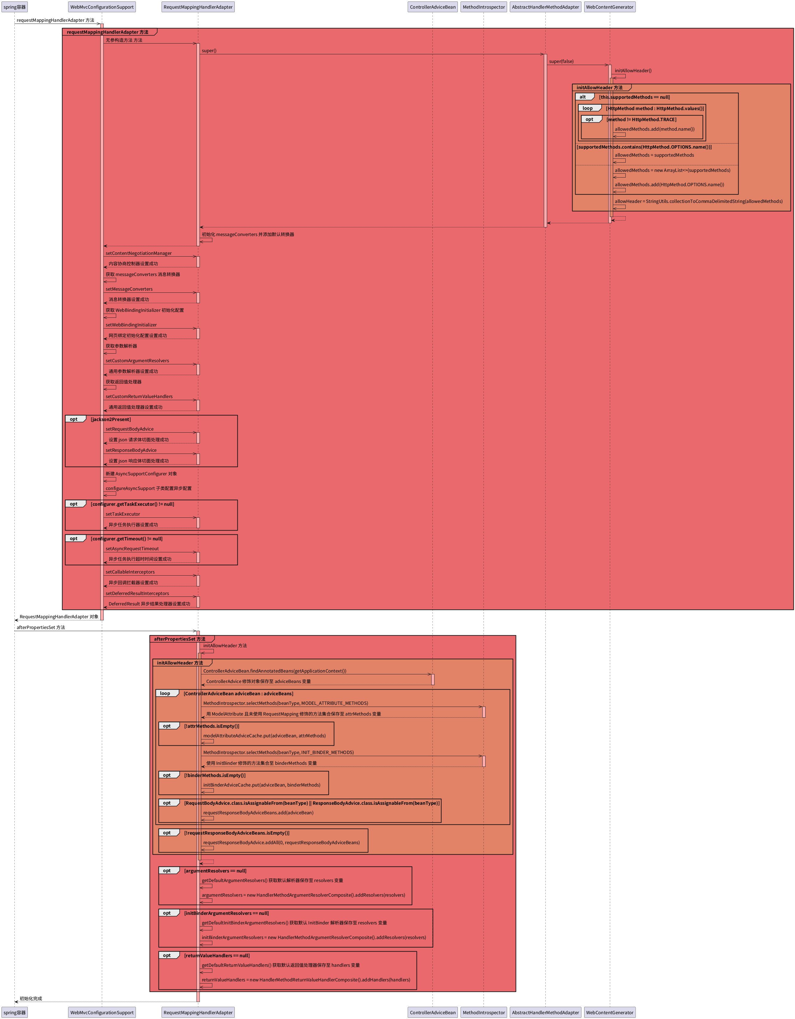 afterPropertiesSet 方法用于 RequestMappingHandlerAdapter 对象参数设置完的初始化;其首先调用 initControllerAdviceCache 方法初始化 ControllerAdvice 修饰的对象缓存;在 argumentResolvers 参数为空时,将