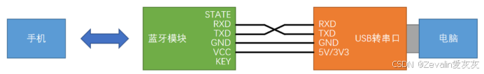 (1)蓝牙模块串口端与USB转串口模块电气连接(USB与电脑连接),蓝牙端与手机进行无线连接。