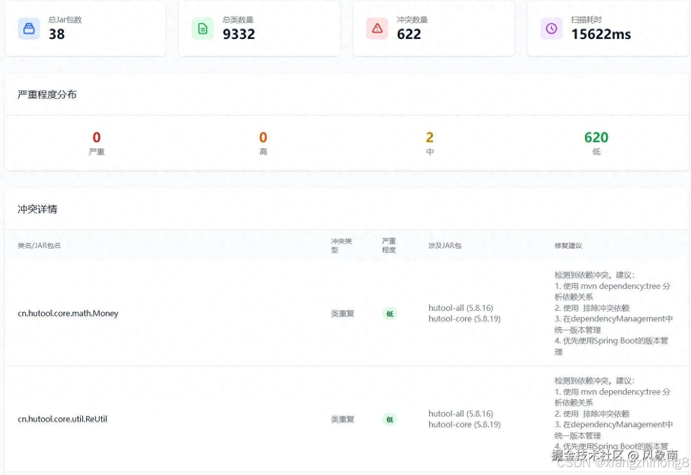 本工具通过配置化规则和运行时扫描,实现了对 Jar 包冲突的自动检测和修复建议。无论开发环境还是生产环境,都可以直观地看到冲突详情,并及时处理。