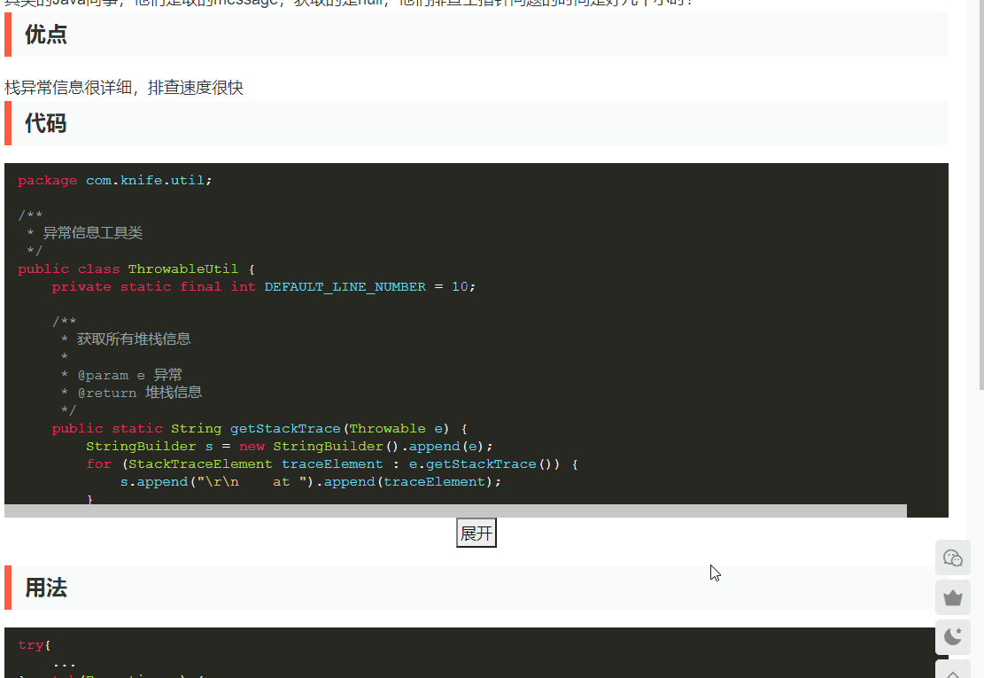 preElements.forEach((preElement) => {// 获取每个 pre 元素的高度和行数const lineHeight = parseInt(window.getComputedStyle(preElement).lineHeight);const height = preElement.offsetHeight;const lineCount = Math.floor(height / lineHeight);// 如果行数超过 20 行,则添加折叠效果if (lineCount > 20) {// 设置初始状态为折叠preElement.style.maxHeight = `${lineHeight * 20}px`;// 创建包裹容器const wrapper = document.createElement('div');wrapper.classList.add('pre-wrapper');// 将 pre 元素包裹在容器内preElement.parentNode.insertBefore(wrapper, preElement);wrapper.appendChild(preElement);// 添加展开/折叠按钮const expandButton = document.createElement('button');expandButton.textContent = '展开';expandButton.classList.add('expand-button');wrapper.appendChild(expandButton);// 展开/折叠按钮的点击事件处理程序expandButton.addEventListener('click', function() {if (!preElement.style.maxHeight) {// 已经展开,点击后折叠preElement.style.maxHeight = `${lineHeight * 20}px`;expandButton.textContent = '展开';} else {// 已经折叠,点击后展开preElement.style.maxHeight = null;expandButton.textContent = '折叠';}});// 设置容器的相对定位和水平居中样式wrapper.style.setProperty('position', 'relative');// 设置展开/折叠按钮的绝对定位和居中样式expandButton.style.setProperty('position', 'relative');expandButton.style.setProperty('top', `-${lineHeight * 1}px`);expandButton.style.setProperty('display', 'block');expandButton.style.setProperty('margin', '0 auto');expandButton.style.setProperty('padding', '3px');}