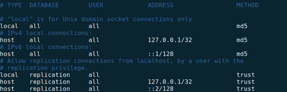 cd /export/servers/app/postgresql-12.5/bin #切换到对应的路径vim pg_hba.conf