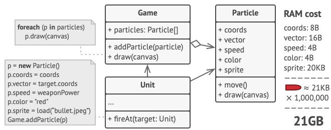 仔细检查`Particle`类时,你可能会注意到`color`(颜色)和`sprite`(精灵图)字段比其他字段占用更多的内存。更糟糕的是,这两个字段在所有粒子中存储了几