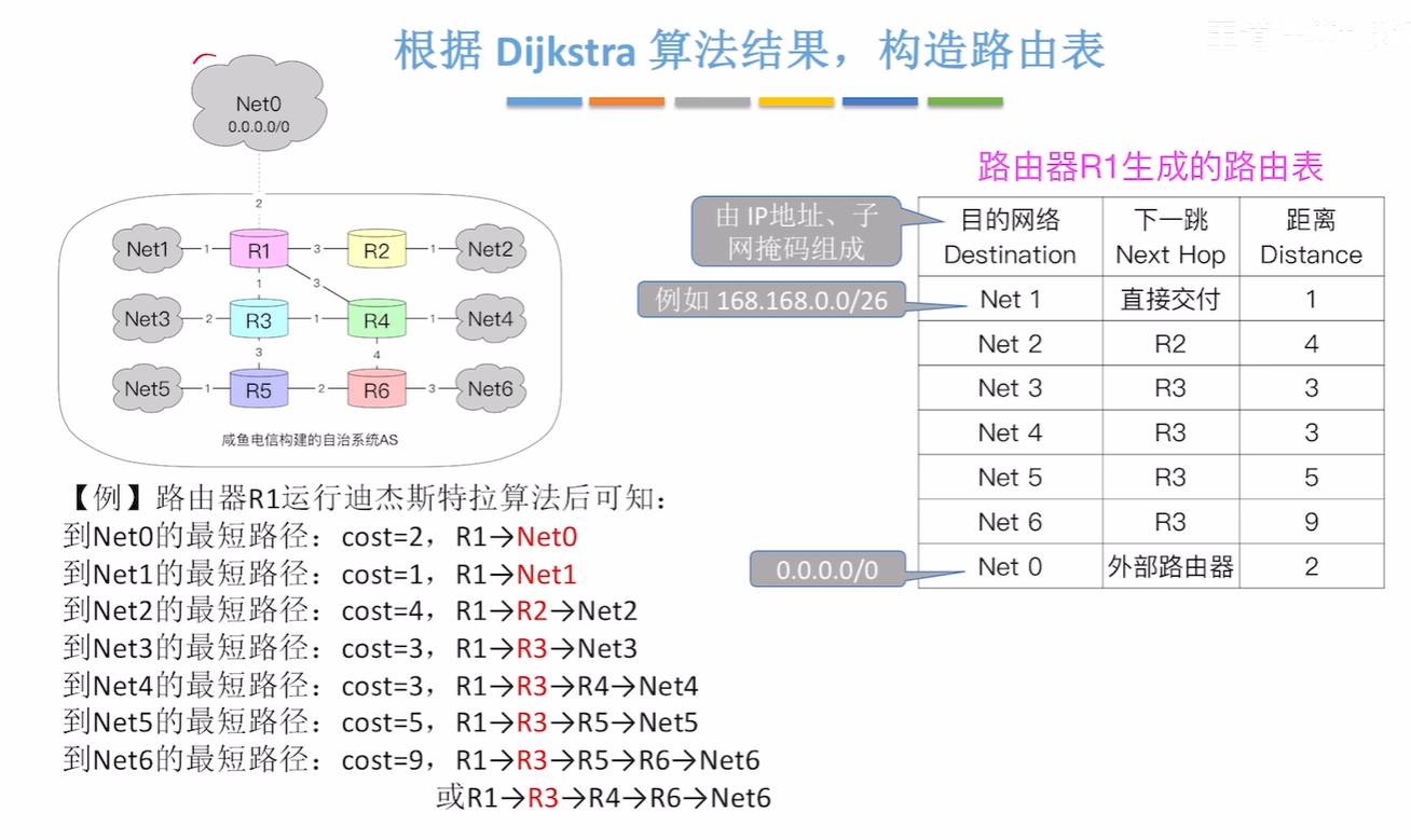 - 虽然使用 Dijkstra 算法能计算出完整的最优路径,但路由表中不会存储完整路径,而只存储 “下一跳”