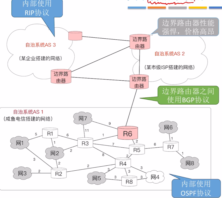 - 每个 AS 至少要有一台自治系统边界路由器(如 R6)与其他自治系统相连。各边界路由器之间,使用统一的外部路由协议(如:BGP-4)。