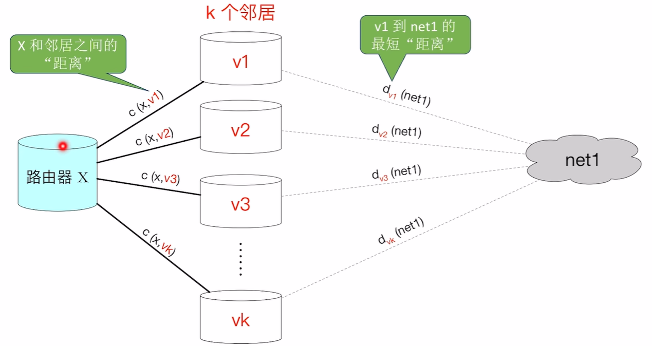 一片区域有多个目的网络,因此一个节点可以用向量来表示到每个目的网络的距离。假设有三个目的网络,那么节点v1的最短距离就为<d(net1), d(net2), d(net3)>。