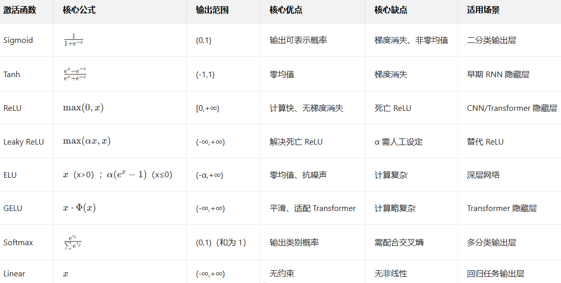 - 特性:无非线性,直接输出模型预测值,配合MSE(均方误差) 损失解决回归任务(如房价预测、股价预测)。