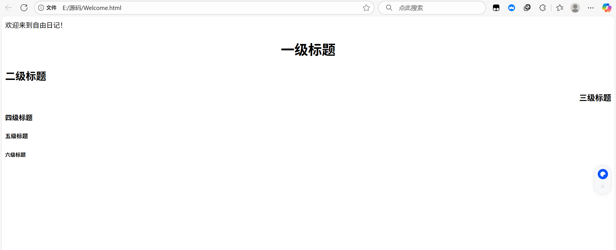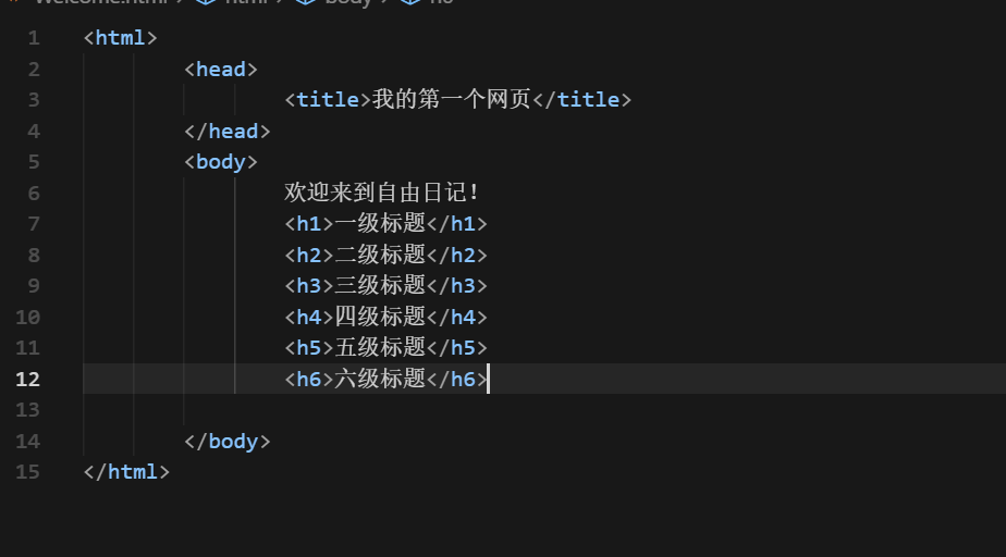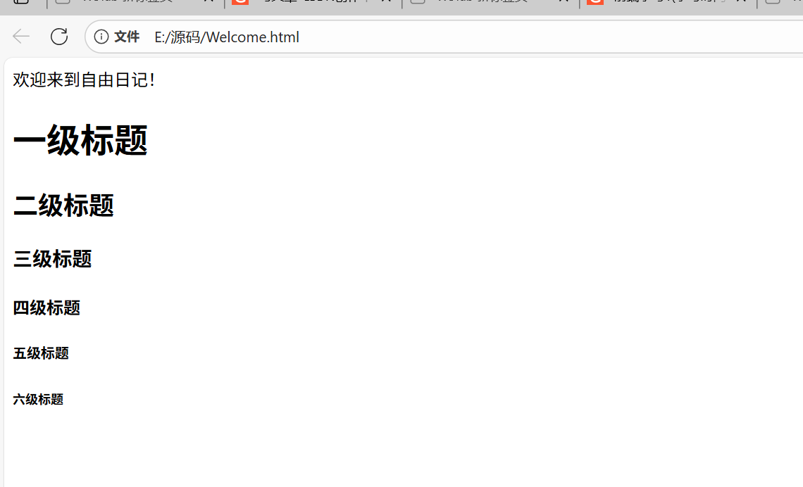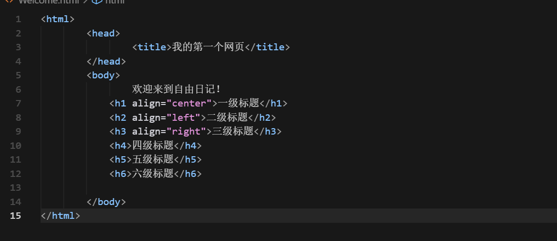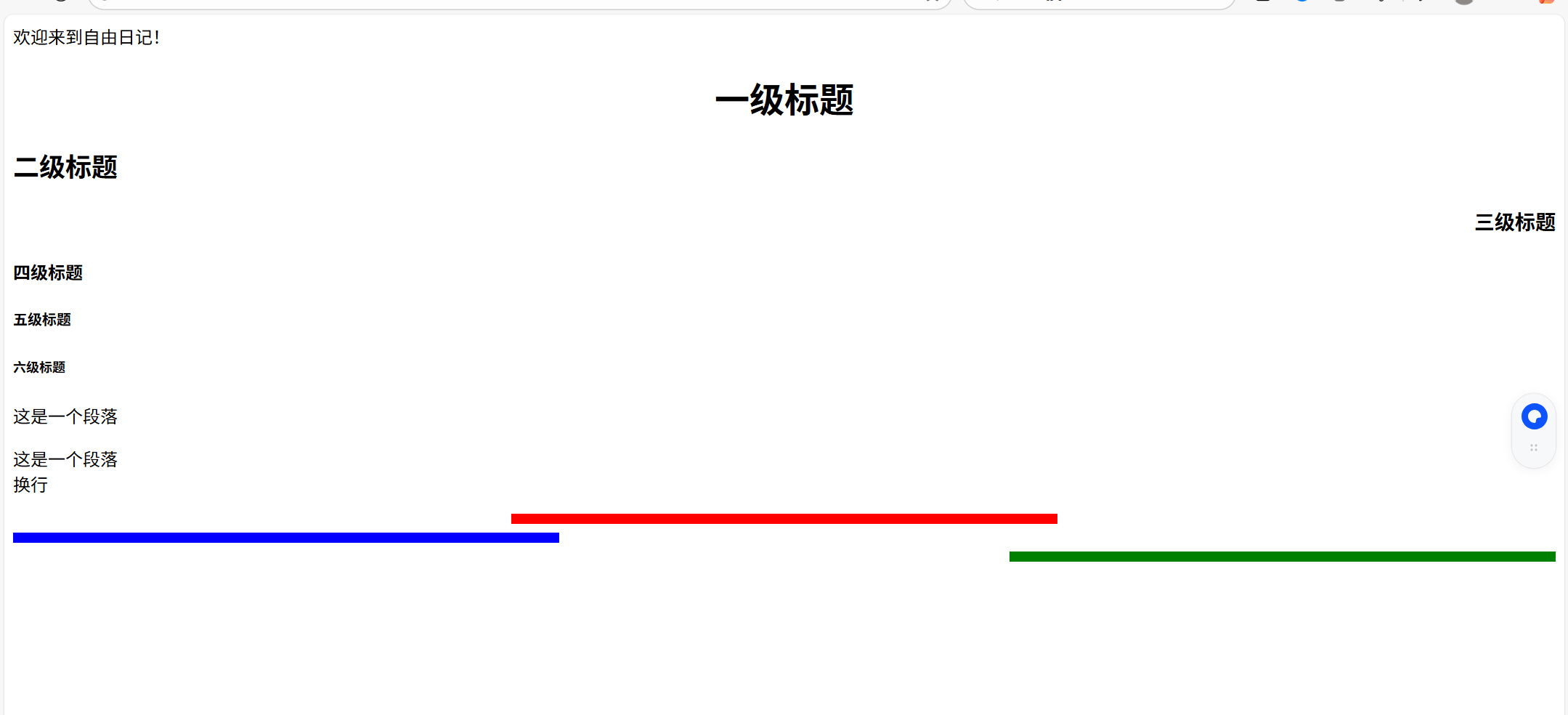 <html><head><title>我的第一个网页</title></head><body>欢迎来到自由日记!<h1 align="center">一级标题</h1><h2 align="left">二级标题</h2><h3 align="right">三级标题</h3><h4>四级标题</h4><h5>五级标题</h5><h6>六级标题</h6><p>这是一个段落</p><p>这是一个段落<br>换行</p><hr color="red" size="10" width="500px"><hr color="blue" size="10" width="500px" align="left"><hr color="green" size="10" width="500px" align="right"></body>