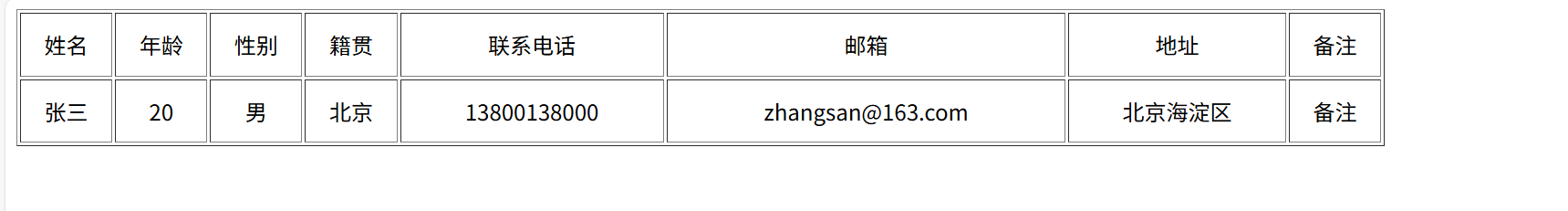 <html><head><title>我的第一个网页</title></head><body><table border="1" width="1000px" height="100px"><tr align="center"><td>姓名</td><td>年龄</td><td>性别</td><td>籍贯</td><td>联系电话</td><td>邮箱</td><td>地址</td><td>备注</td> </tr><tr align="center"><td>张三</td><td>20</td><td>男</td><td>北京</td><td>13800138000</td><td>zhangsan@163.com</td><td>北京海淀区</td><td>备注</td></tr></table></body></body>