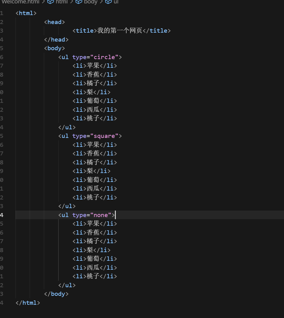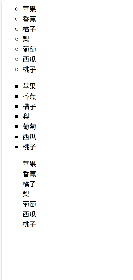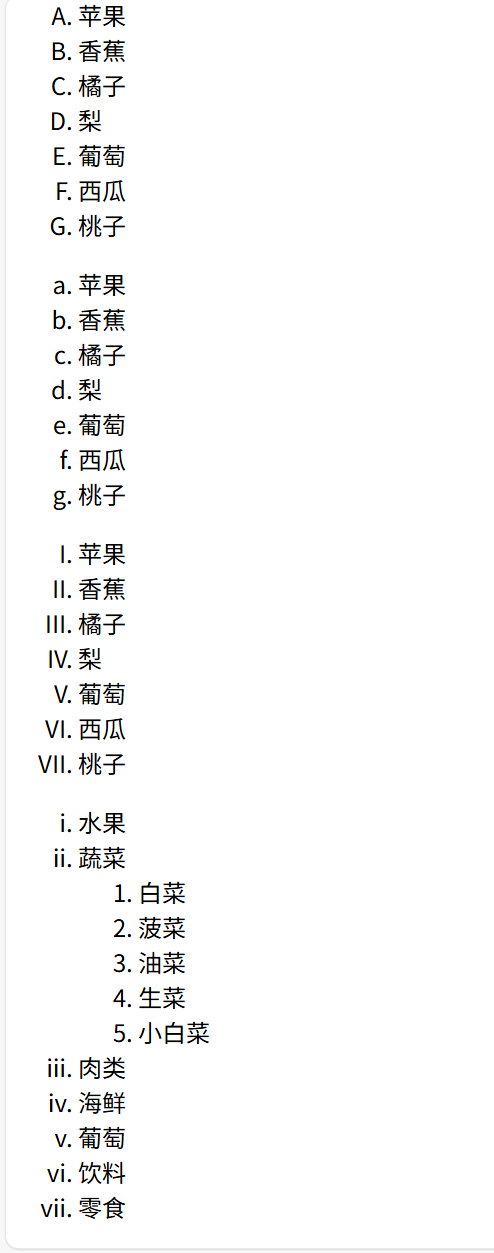 <html><head><title>我的第一个网页</title></head><body><ol><li>苹果</li><li>香蕉</li><li>橘子</li><li>梨</li><li>葡萄</li><li>西瓜</li><li>桃子</li></ol><ol type="A"><li>苹果</li><li>香蕉</li><li>橘子</li><li>梨</li><li>葡萄</li><li>西瓜</li><li>桃子</li></ol><ol type="a"><li>苹果</li><li>香蕉</li><li>橘子</li><li>梨</li><li>葡萄</li><li>西瓜</li><li>桃子</li></ol><ol type="I"><li>苹果</li><li>香蕉</li><li>橘子</li><li>梨</li><li>葡萄</li><li>西瓜</li><li>桃子</li></ol><ol type="i"><li>水果</li><li>蔬菜<ol type="1"><li>白菜</li><li>菠菜</li><li>油菜</li><li>生菜</li><li>小白菜</li></ol></li><li>肉类</li><li>海鲜</li><li>葡萄</li><li>饮料</li><li>零食</li></ol></body>