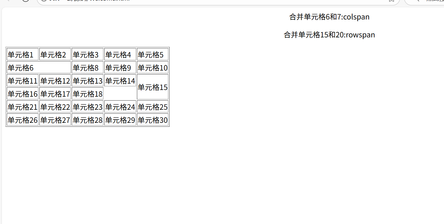 <html><head><title>我的第一个网页</title></head><body><P align="center">合并单元格6和7:colspan</P><p align="center">合并单元格15和20:rowspan</p><table border="1"><tr><td>单元格1</td><td>单元格2</td><td>单元格3</td><td>单元格4</td><td>单元格5</td></tr><tr><td colspan="2">单元格6</td><td>单元格8</td><td>单元格9</td><td>单元格10</td></tr><tr><td>单元格11</td><td>单元格12</td><td>单元格13</td><td>单元格14</td><td rowspan="2">单元格15</td></tr><td>单元格16</td><td>单元格17</td><td>单元格18</td></tr><tr><td>单元格21</td><td>单元格22</td><td>单元格23</td><td>单元格24</td><td>单元格25</td></tr><tr><td>单元格26</td><td>单元格27</td><td>单元格28</td><td>单元格29</td><td>单元格30</td></tr></table></body></body>