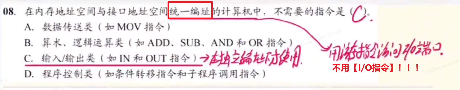 - 注意:只有在【独立编址(I/O映射)】的方式下,才会用到【I/O指令】
