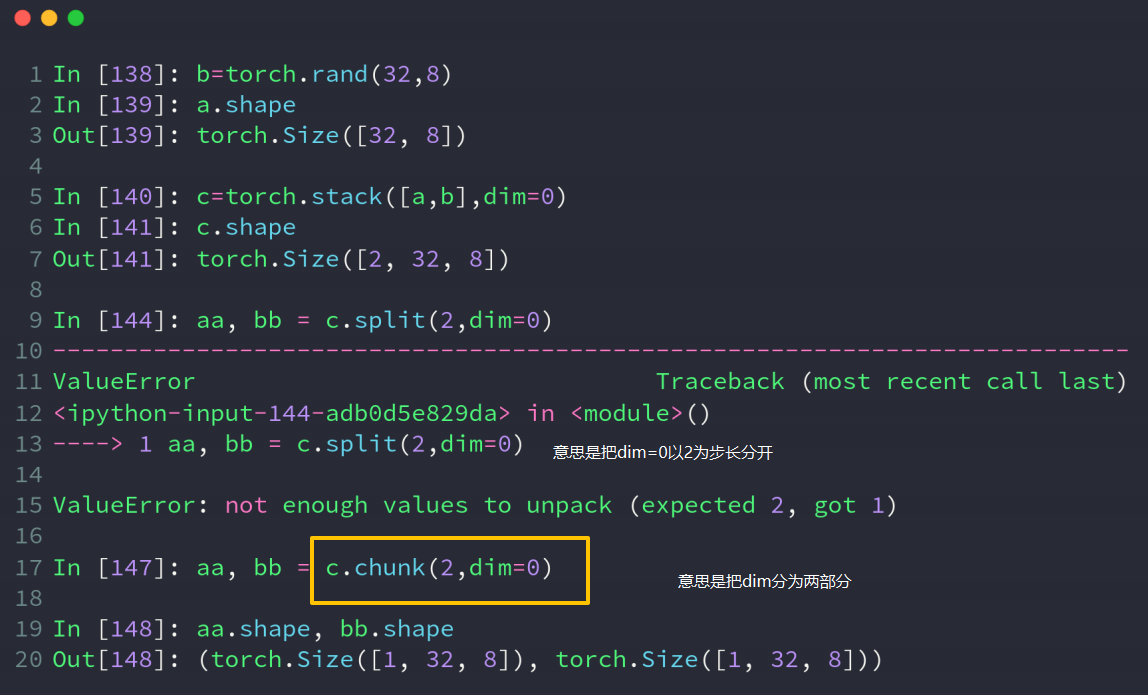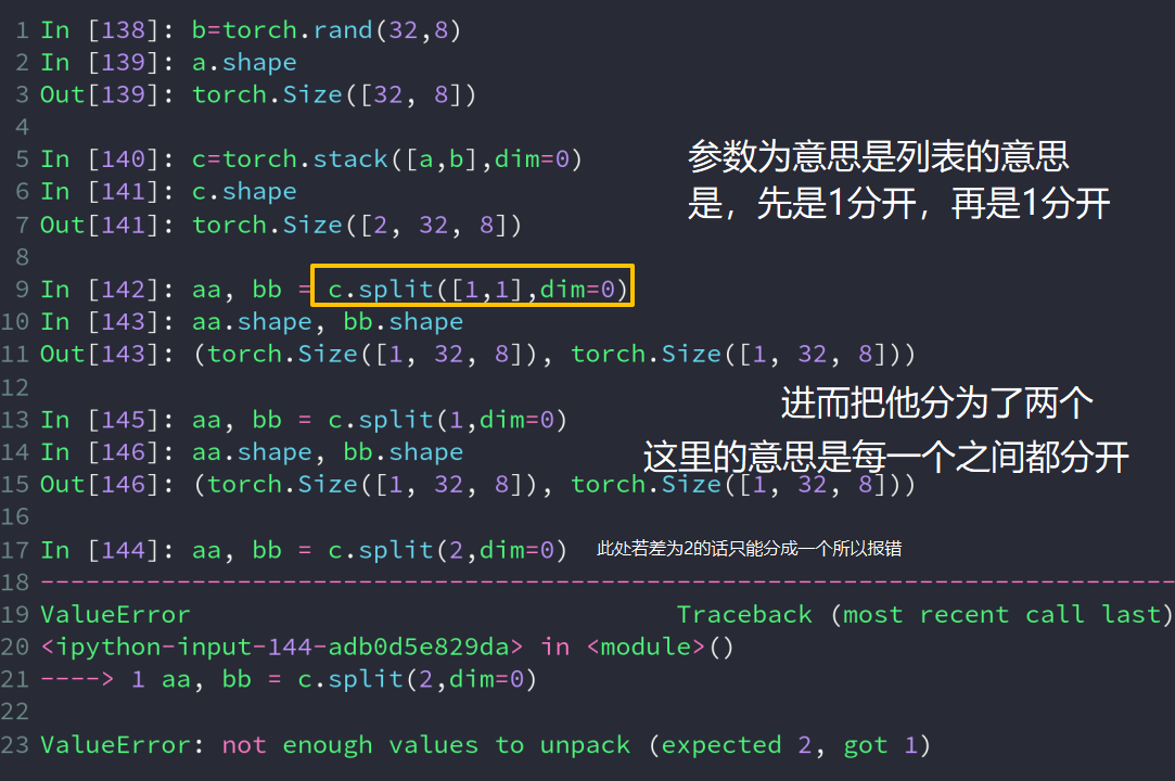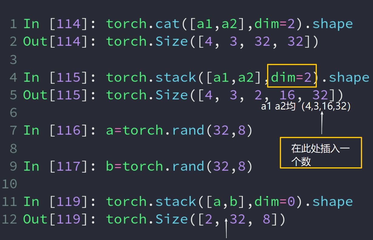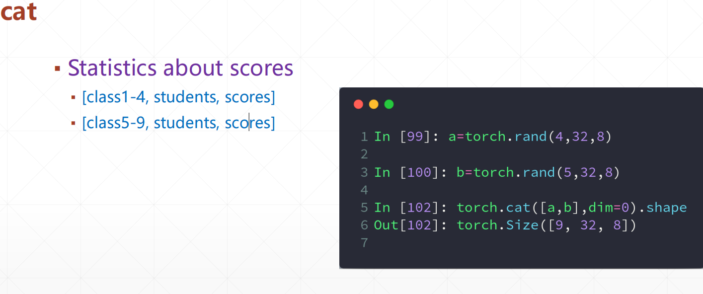 ###意思是将dim=0进行合并,此时必须保证的是其他的dim都是一样的数Out:torch.Size([9,32,8])