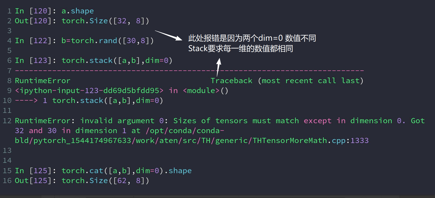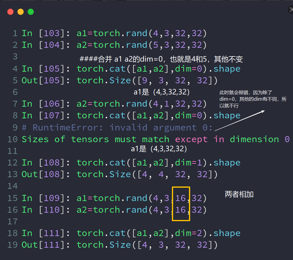 Cat使用的条件:必须是维数相同,除合并 的dim外都要是相同的数