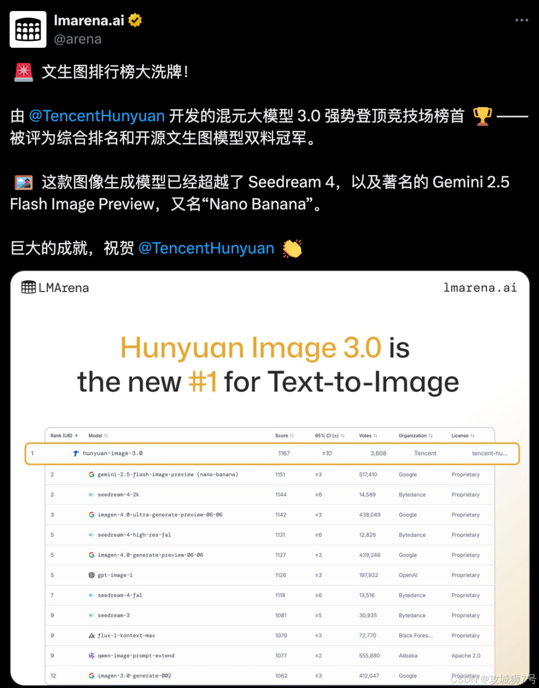 就在最近,全球最权威的AI竞技场之一——由加州大学伯克利分校主导的LMArena平台,公布了其文生图榜单的最新结果。出乎许多人意料,登顶榜首的并非大家熟知的Midjourney或谷歌、OpenAI的最新力作,而是一个来自中国的名字:腾讯混元图像3.0。