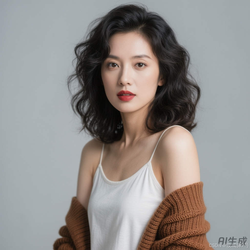 例如,当用户输入一段极其详细的人像摄影指令:“……亚洲女性,白皙皮肤,黑色及肩波浪卷发,直视镜头,红唇微张,身穿白色细吊带背心,右臂套着棕色罗纹长袖毛衣……”。