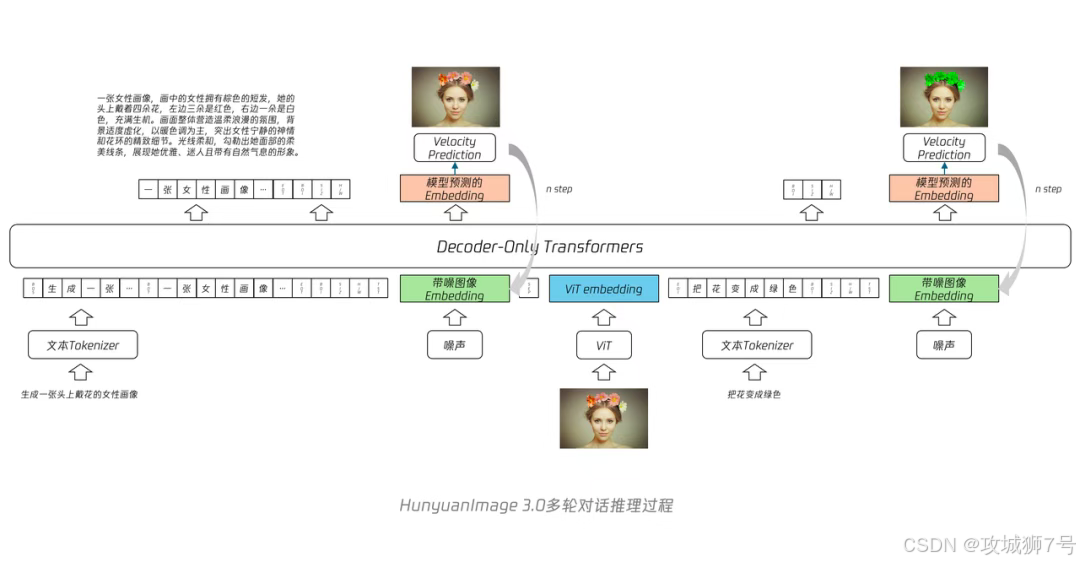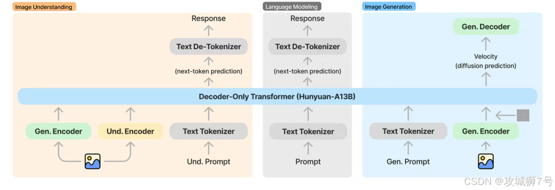 首先,它是一个“原生思想家”,而非“拼接工具人”。很多早期的多模态模型,更像是将一个强大的语言模型(负责理解)和一个强大的图像模型(负责绘画)“粘”在一起。而混元采用的“原生多模态架构”,从设计之初就让模型同时具备语言的思考能力和图像的生成能力。官方提出的“Transfusion”机制,深度耦合了Transformer的长文本理解能力和Diffusion的图像生成能力,使其“大脑”和“双手”能够协同一致地工作。这就像一个自带哲学思想的画家,而不是一个听指令干活的画匠。