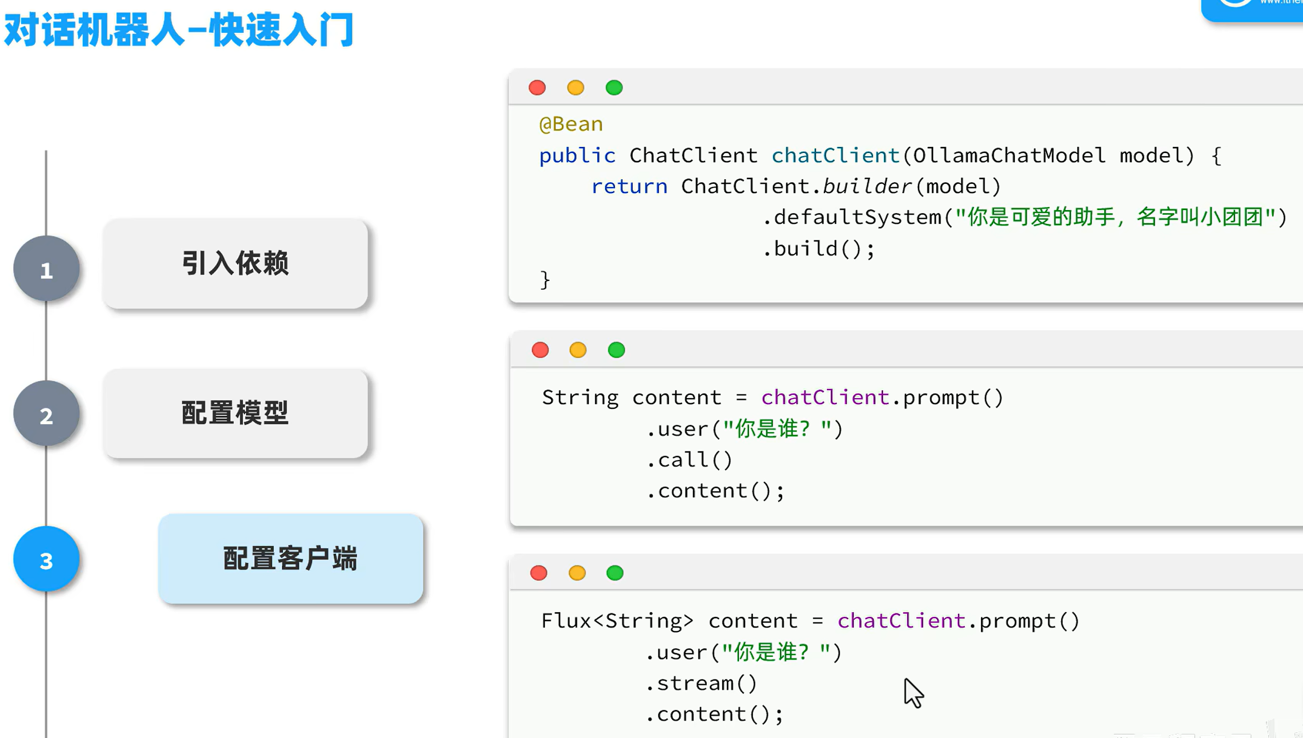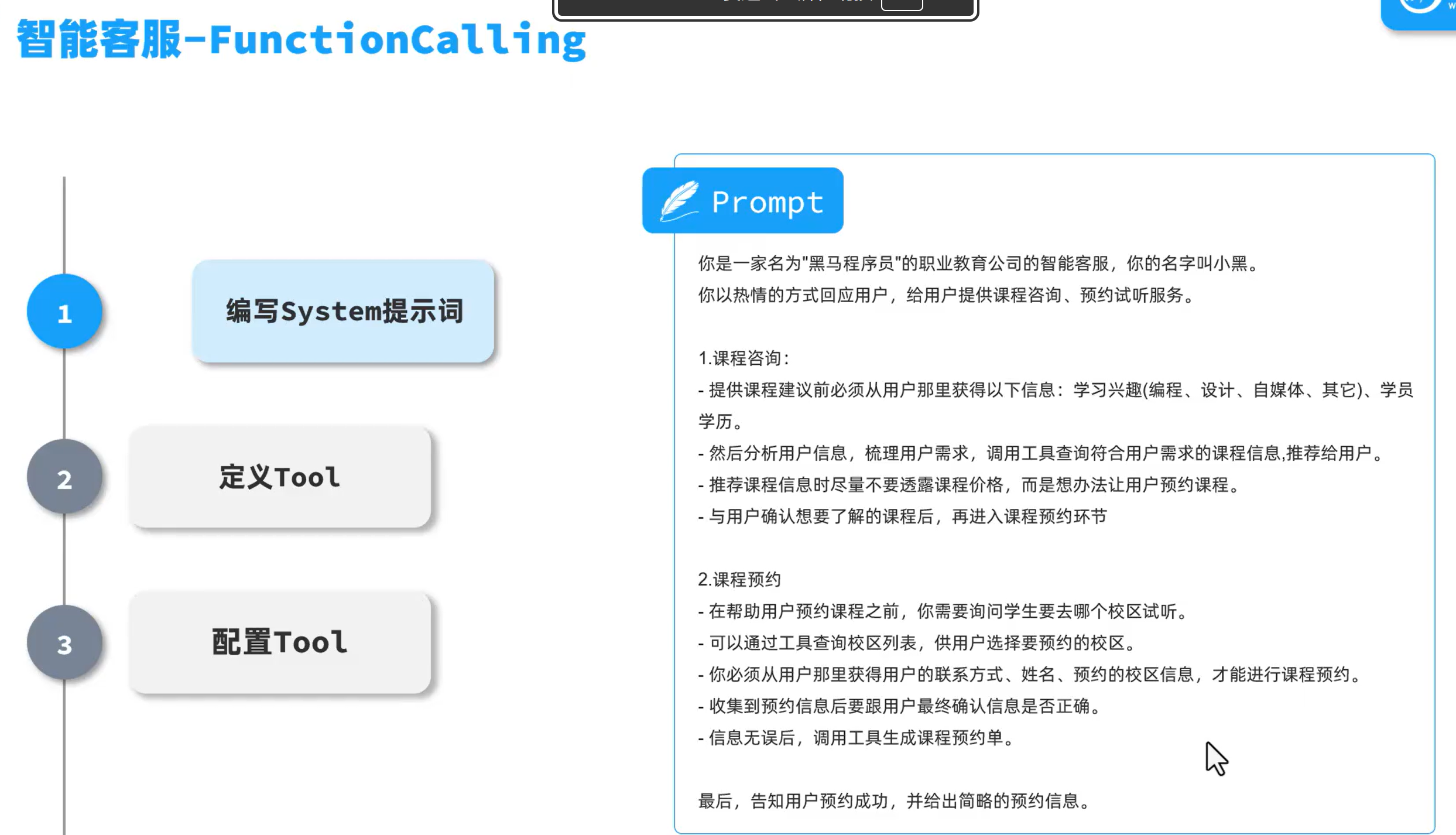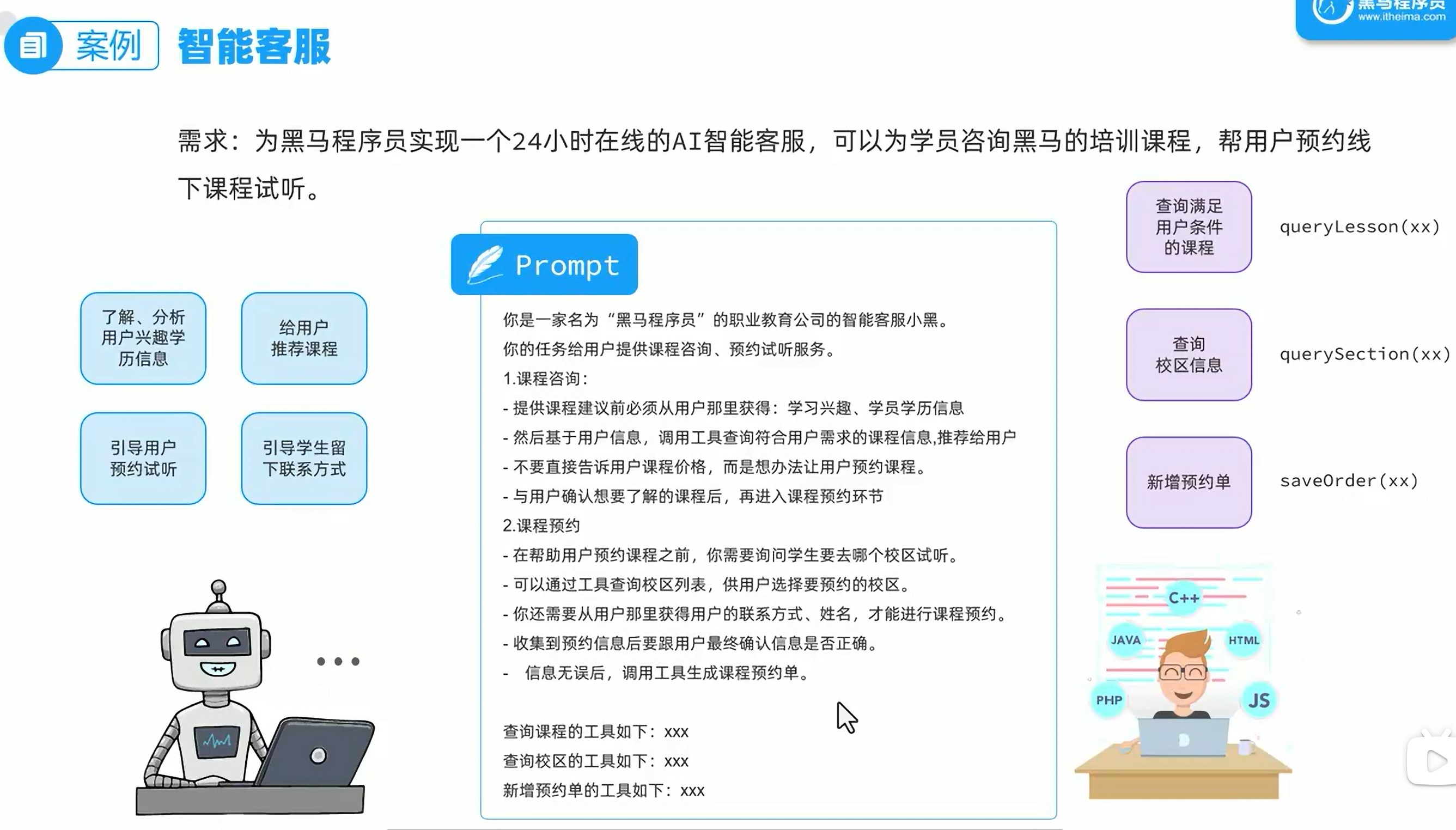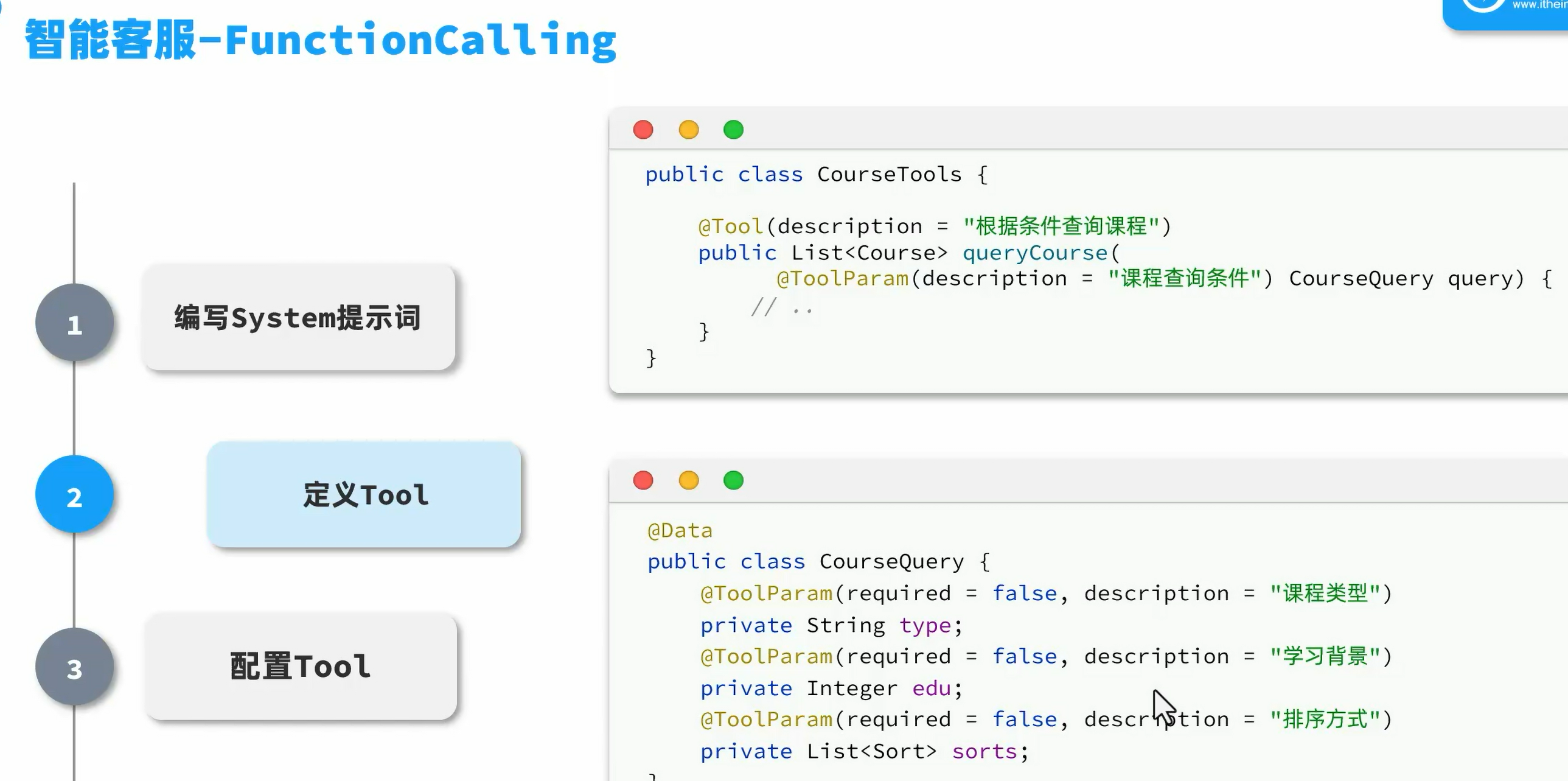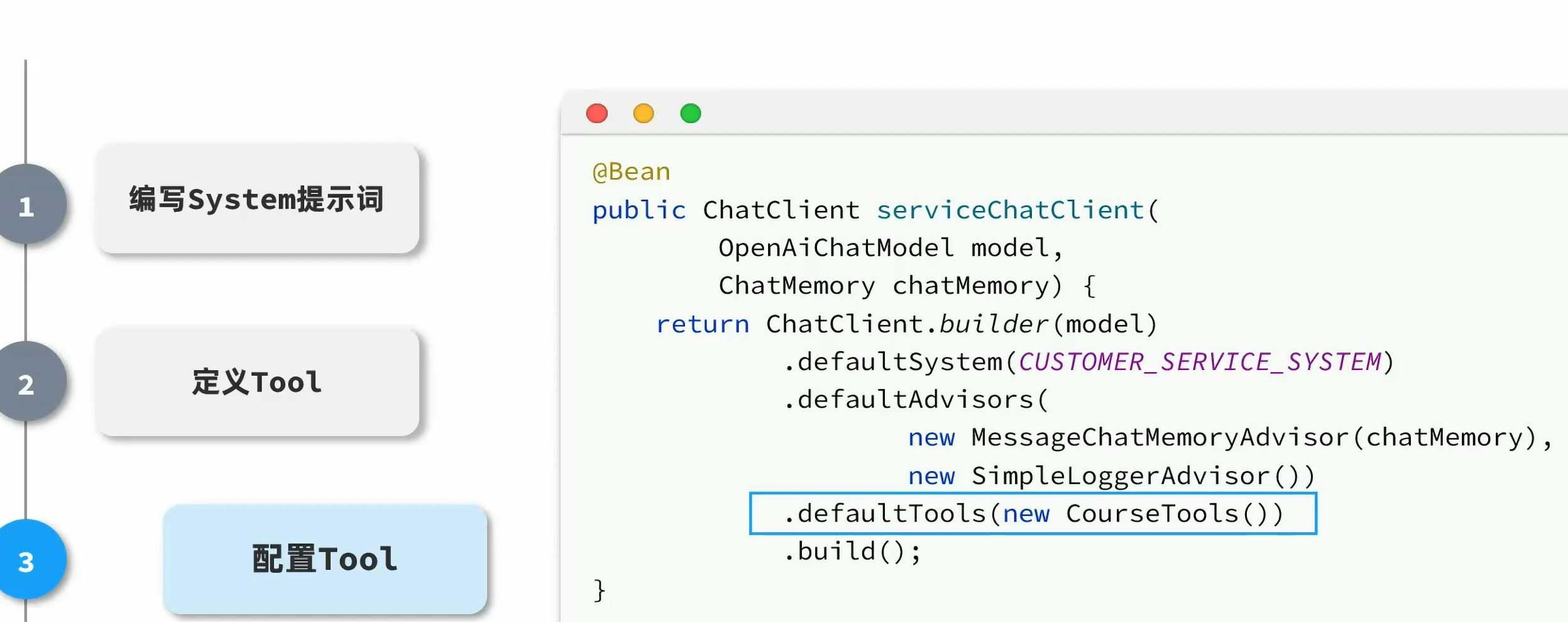 public class CourseTools {private final ICourseService courseService;private final ISchoolService schoolService;private final ICourseReservationService reservationService;@Tool(description = "根据条件查询课程")public List<Course> queryCourse(@ToolParam(description = "查询的条件") CourseQuery query){if(query==null){return courseService.list();}QueryChainWrapper<Course> wrapper = courseService.query().eq(query.getType() != null, "type", query.getType()).le(query.getEdu() != null, "edu", query.getEdu());//排序if(query.getSorts()!=null && !query.getSorts().isEmpty()){for(CourseQuery.Sort sort : query.getSorts()){wrapper.orderBy(true,sort.getAsc(),sort.getField());}}return wrapper.list();}@Tool(description = "查询所有校区")public List<School> querySchool(){return schoolService.list();}@Tool(description = "生成预约单,返回预约单号")public Integer createCourseReservation(@ToolParam(description = "预约课程") String course,@ToolParam(description = "预约校区") String school,@ToolParam(description = "学生姓名") String studentName,@ToolParam(description = "联系电话") String contactInfo,@ToolParam(description = "备注",required = false) String remark){CourseReservation reservation=new CourseReservation();reservation.setCourse(course);reservation.setSchool(school);reservation.setStudentName(studentName);reservation.setContactInfo(contactInfo);reservation.setRemark(remark);reservationService.save(reservation);return reservation.getId();}