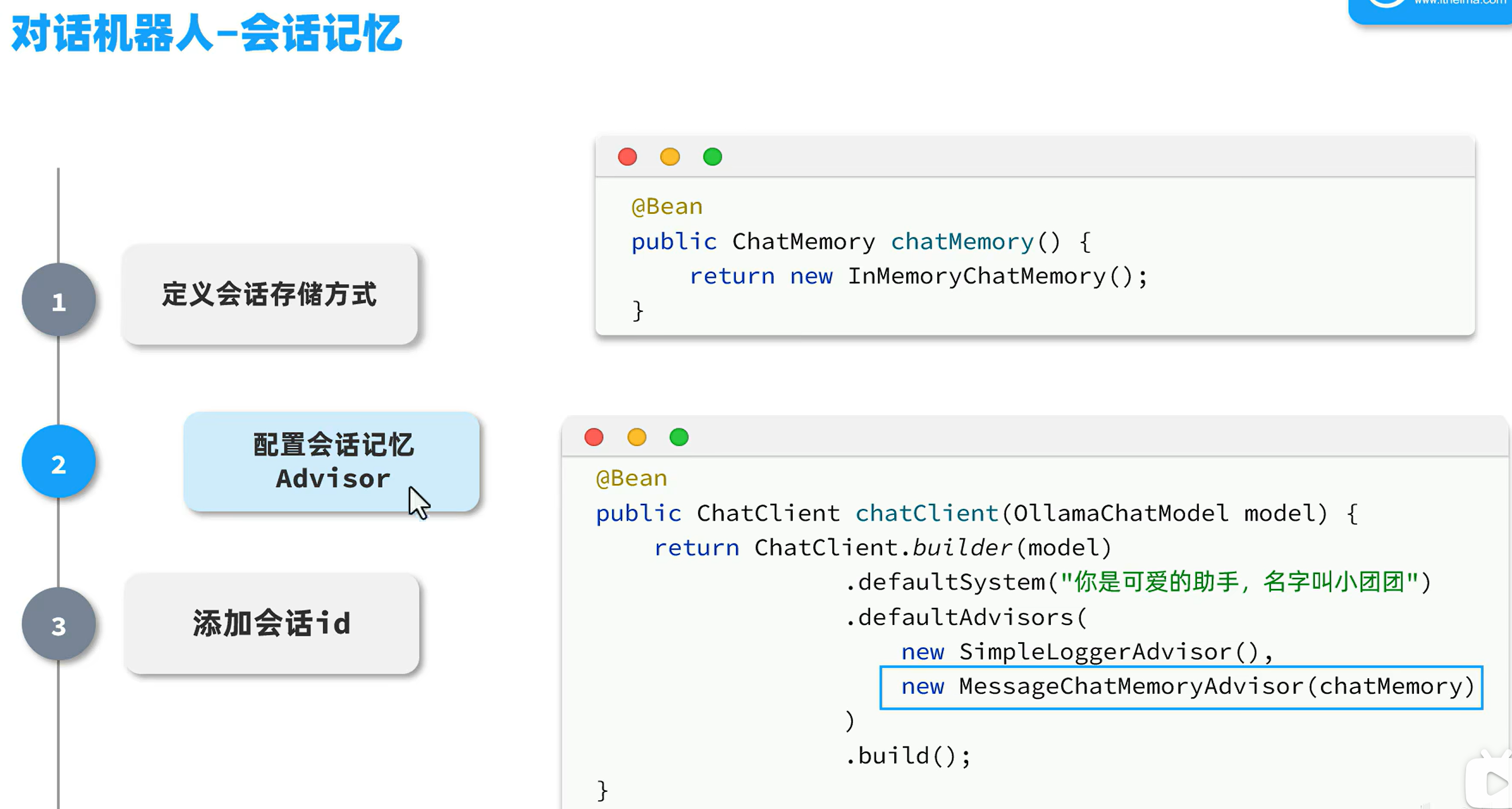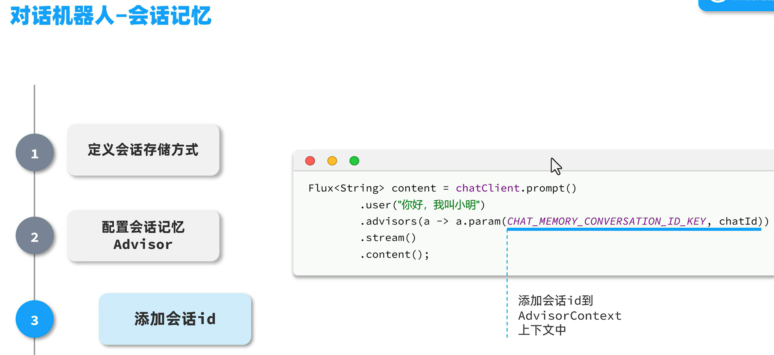 如果不添加会话id,每次开启对话,ai都会认为是同一个人在跟他聊天,不能区分不同的会话。可以将前端传过来的会话id,配置到后端,这样ai就会记住每个对话不同,里面的内容分属于不同的人