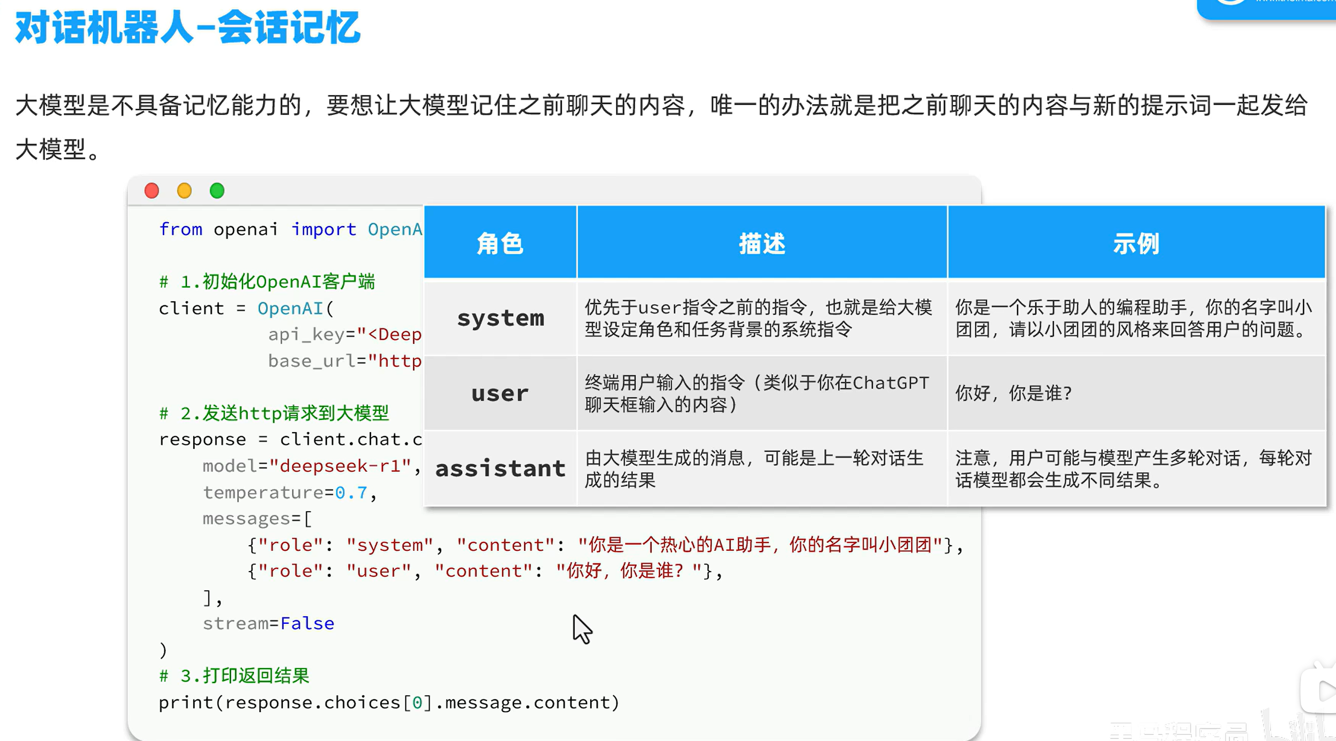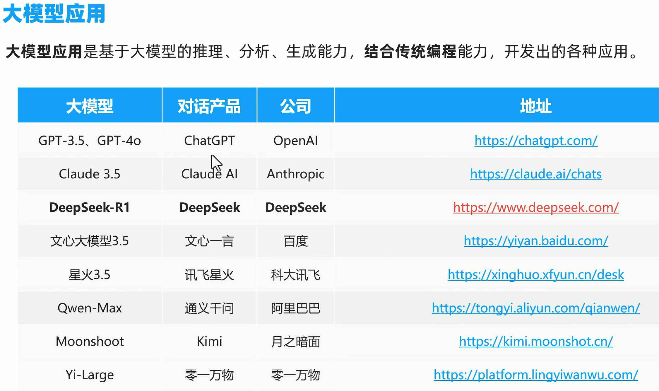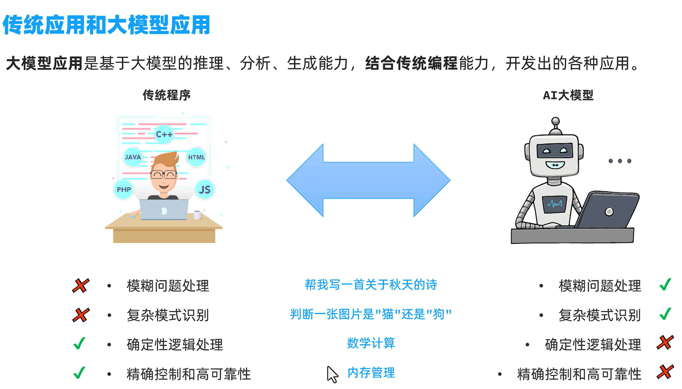 例子:大模型是没有记忆的,对于之前的对话没有记忆,每次对话都是一次新的开始,而结合传统程序,就可以把之前对话的记录存储起来,然后和新的问题拼接,然后都发给大模型,这样大模型也就拥有了“记忆”。大模型应用就是把传统应用和大模型应用结合起来