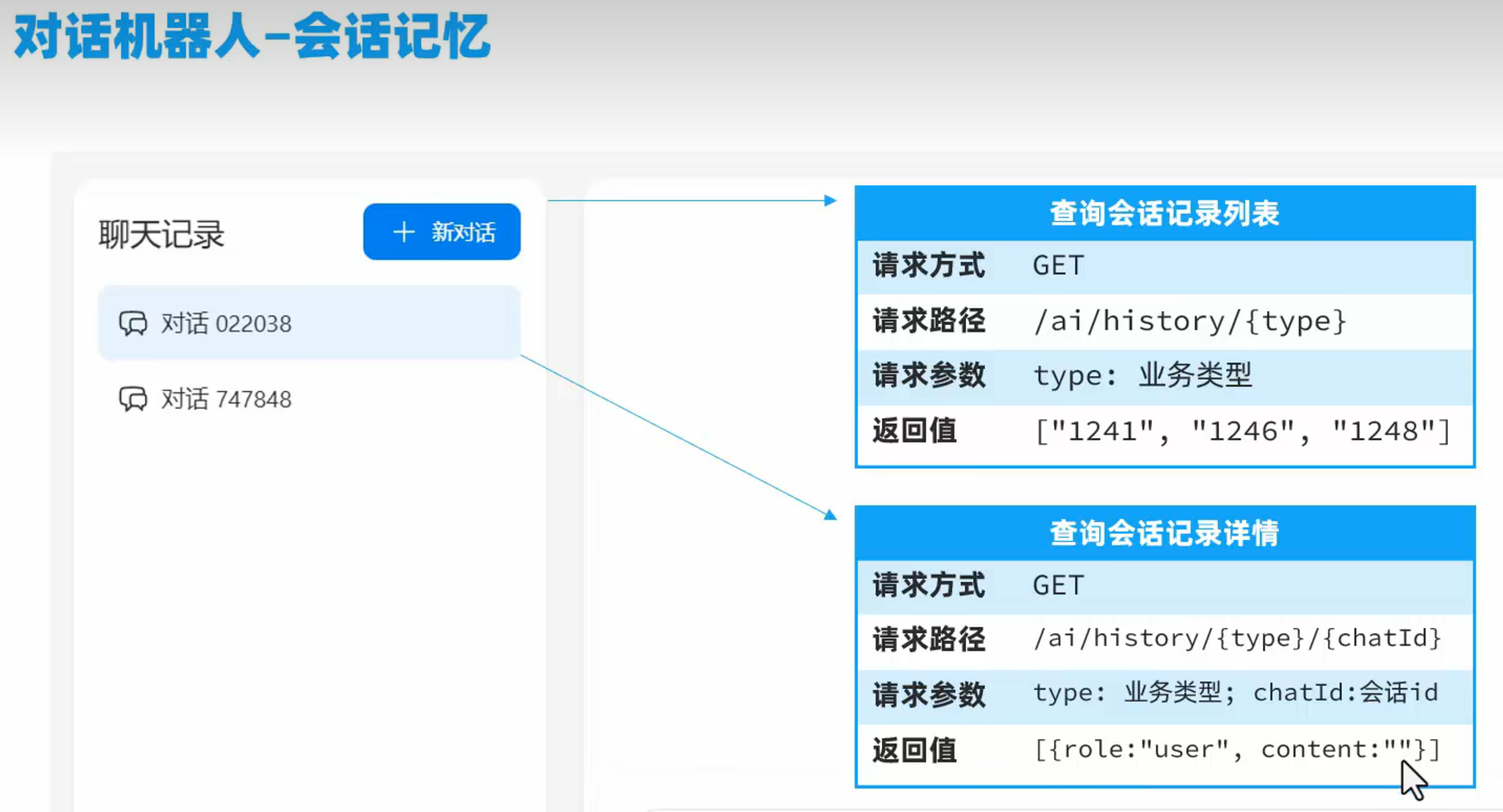 在进入前端界面的时候,会将当前页面是哪个业务模块type传递给后端,返回当前业务模块开启的会话id(这里的id没有实现存储,可以利用数据库表实现以下,记录会话id对于的业务类型)。查询会话记录详情的时候,把业务模块type和会话id发送给后端,返回会话历史数据,这里的历史数据要区分哪部分是用户问的,哪部分是ai回答的。