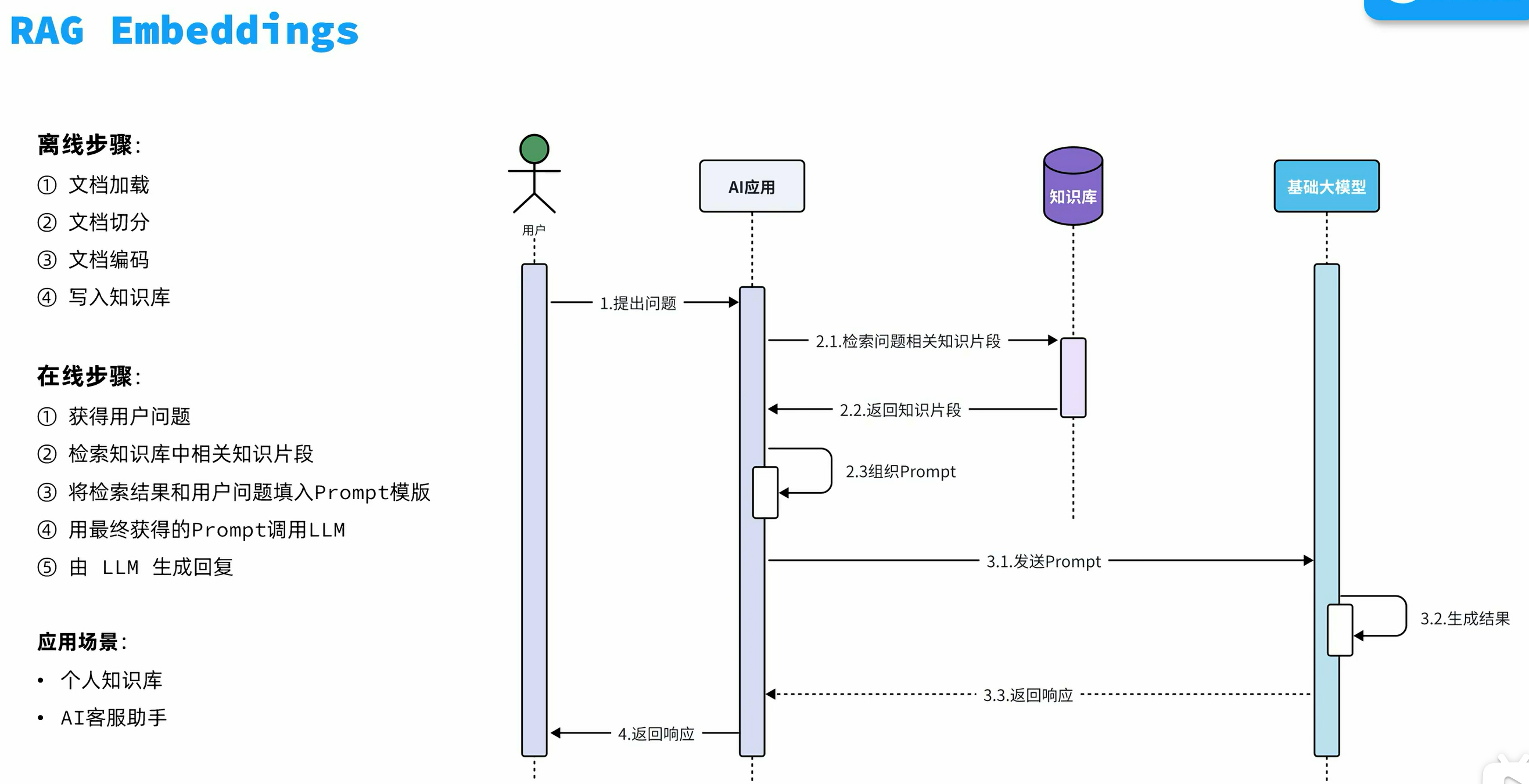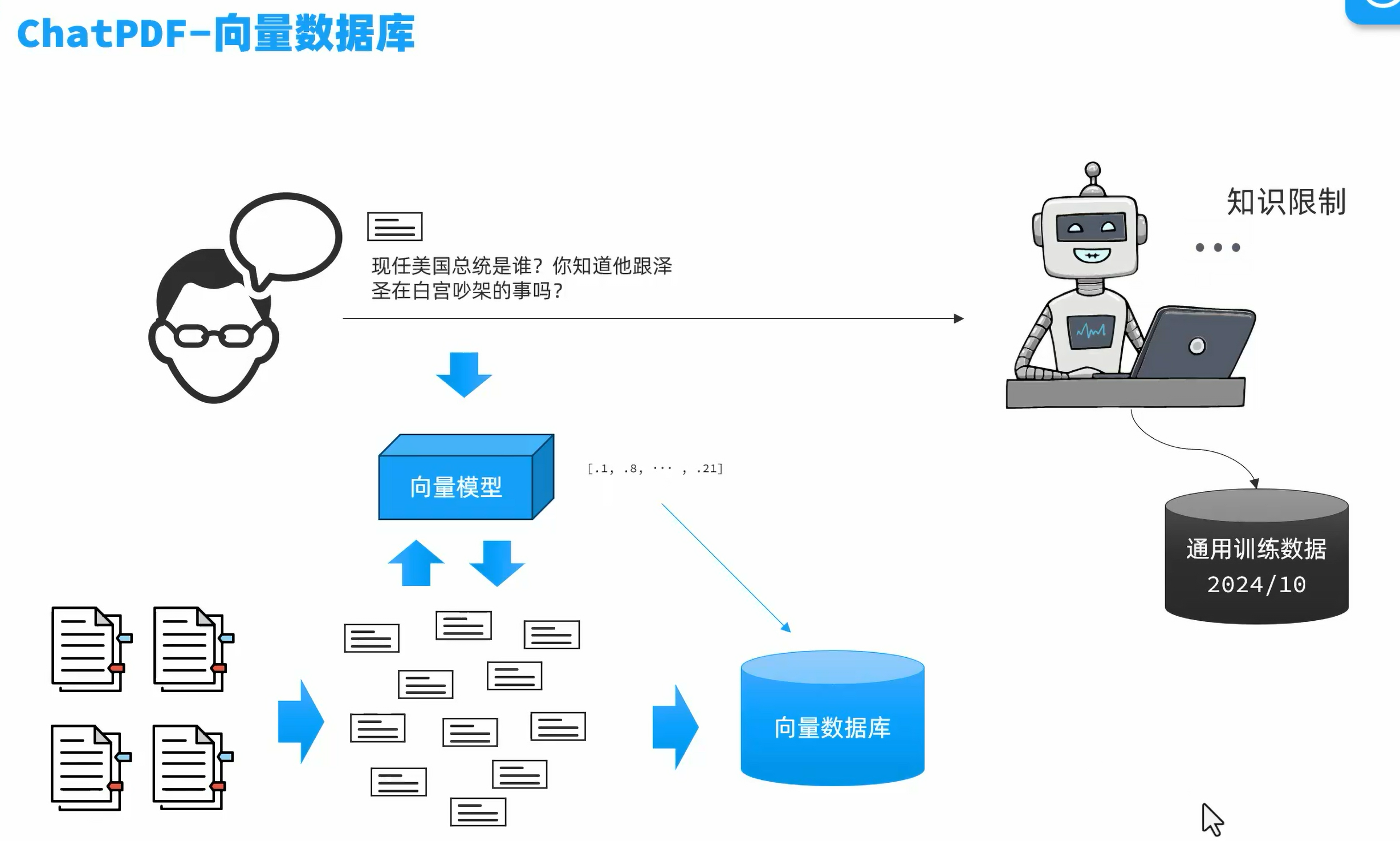 把划分为碎片的知识数据放入通过向量模型翻译成向量,然后把用户的问题也翻译成向量,把这些向量都放到向量数据库当中,然后向量数据库就可以根据用户提问的问题找出和用户问题最相似的知识片段,然后把这个知识片段发给大模型,让大模型作出回答。