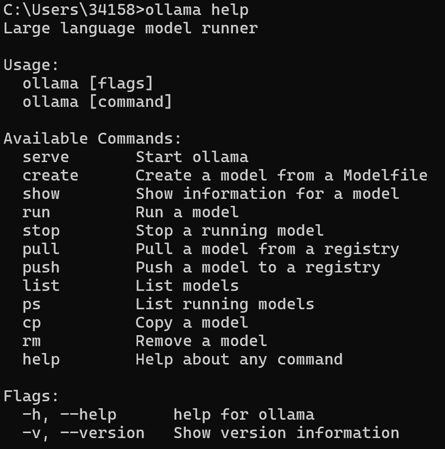 直接打开cmd命令行,输入ollama help查询命令