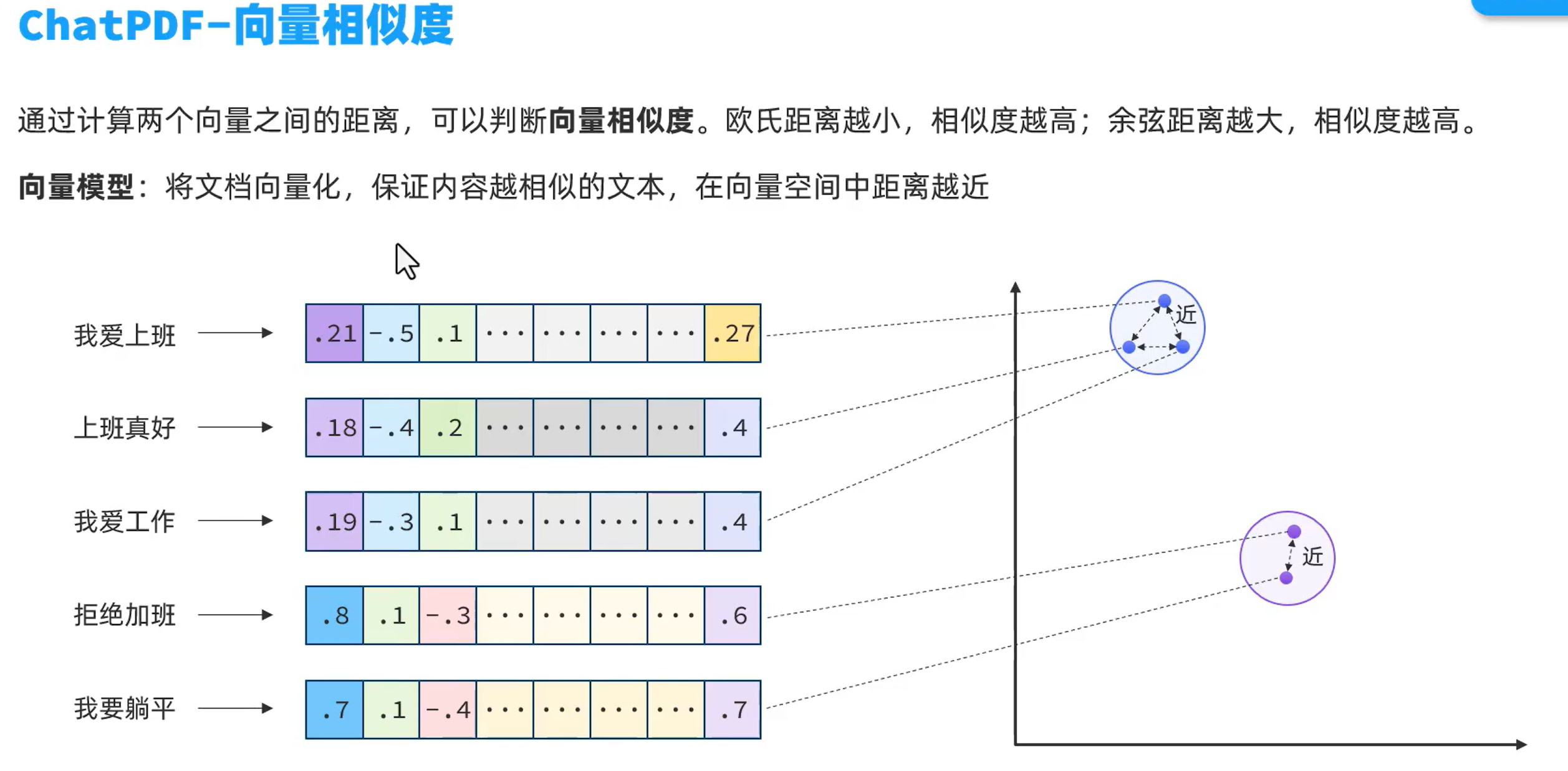 将文档中的内容通过某种算法计算,映射为数字,然后将数字形成向量,投影到平面,文字意思越相近的内容,距离就越近。
