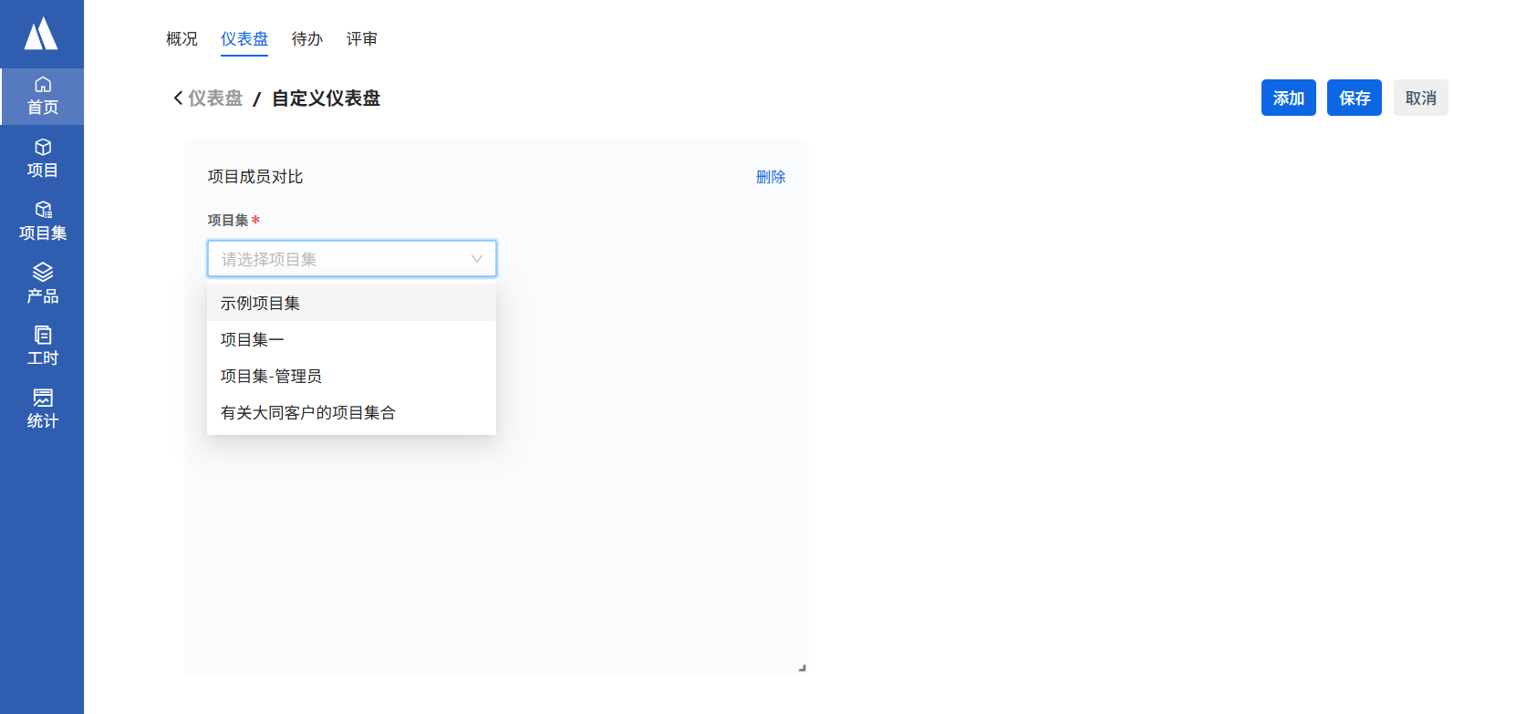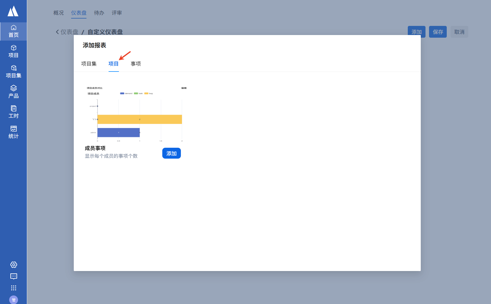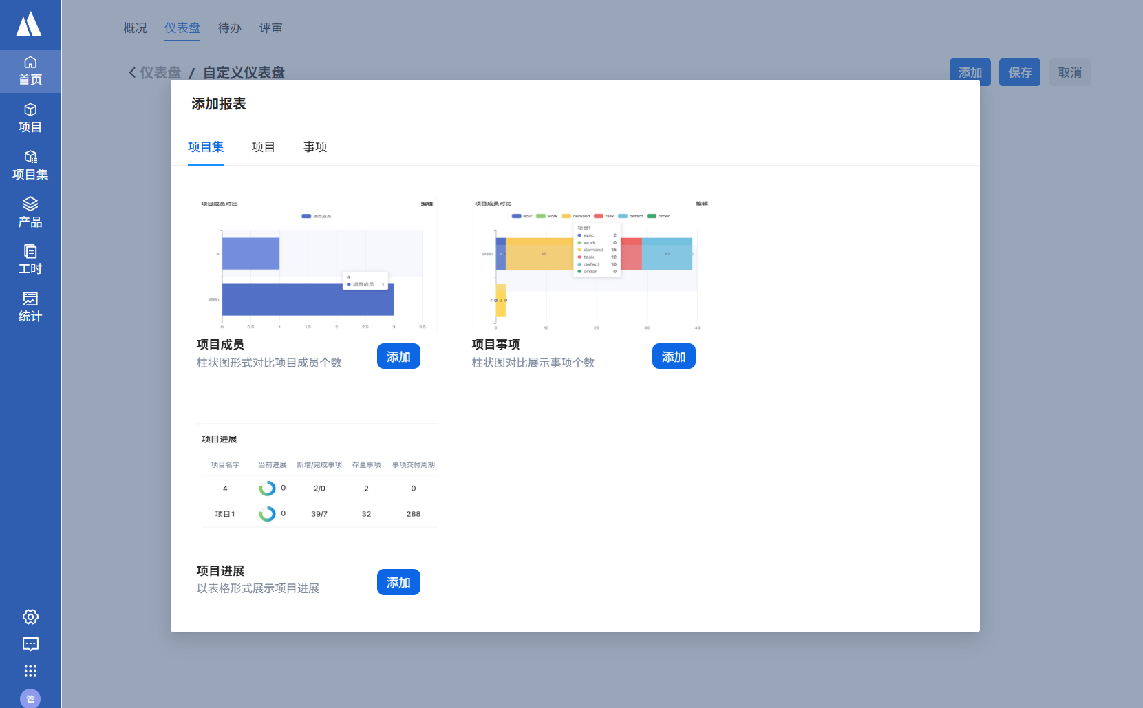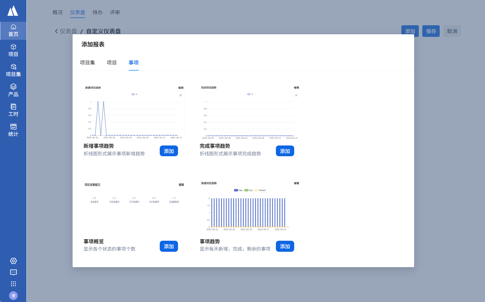 进入仪表盘后选择添加项目集下的图表,并选择想要统计的项目集名称,即可查看到统计图表