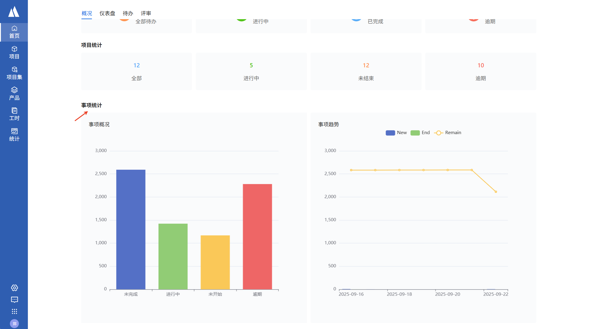 在系统首页的事项统计区域,放置了事项概况与事项趋势图。