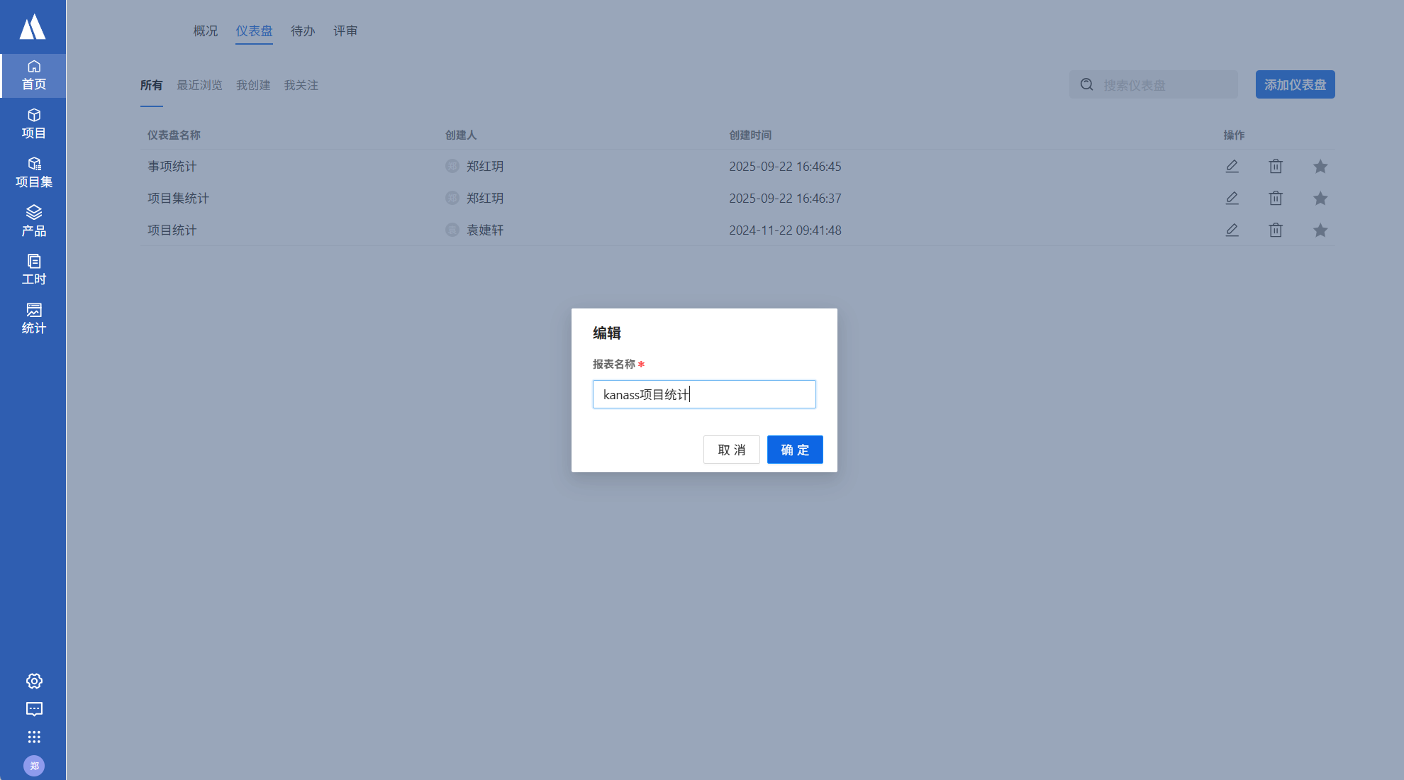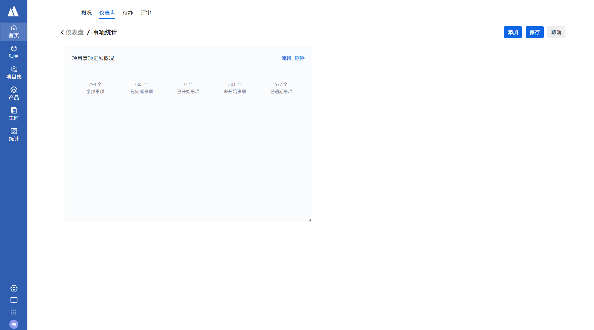 添加仪表盘:首页->仪表盘->添加仪表盘。仪表盘添加成功后,点击进入仪表盘并添加报告,可以选择以项目集维度、项目维度、事项维度来统计并展示数据。