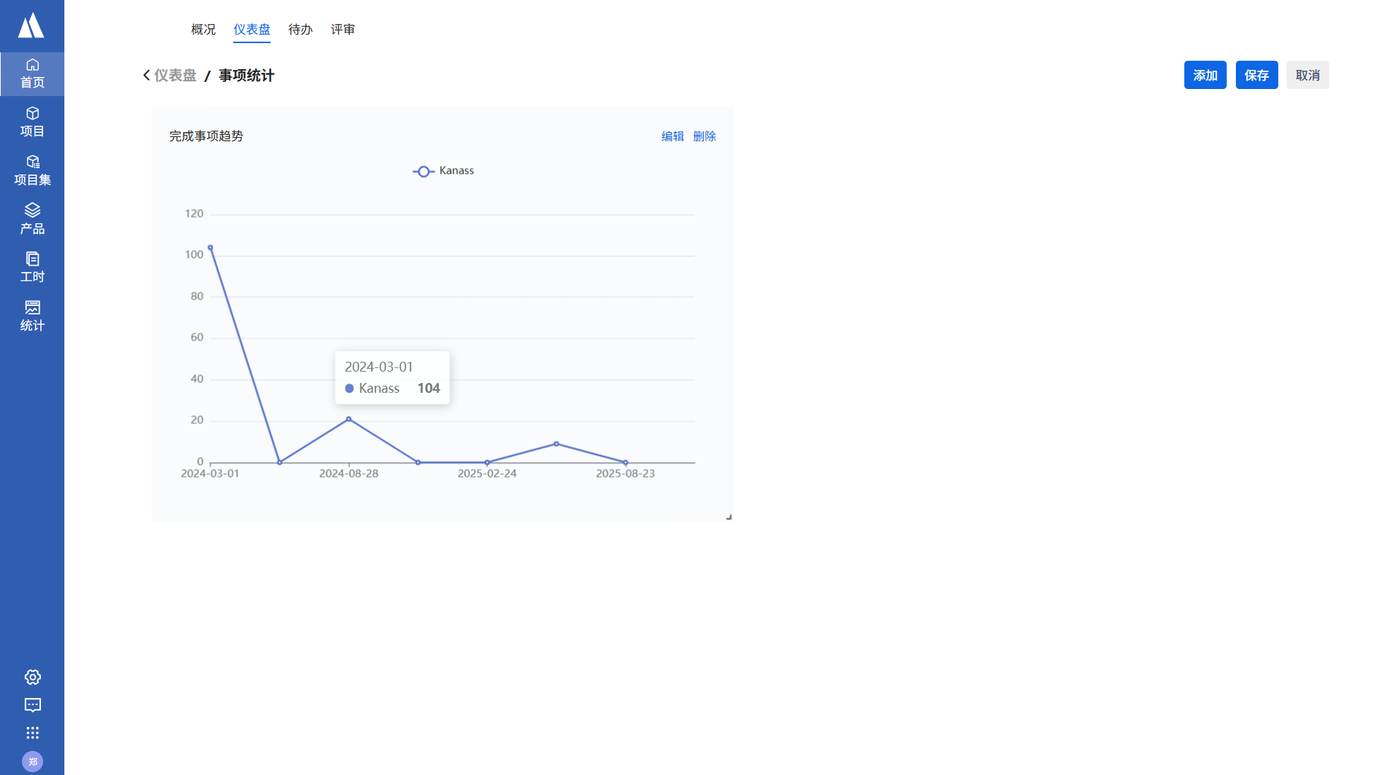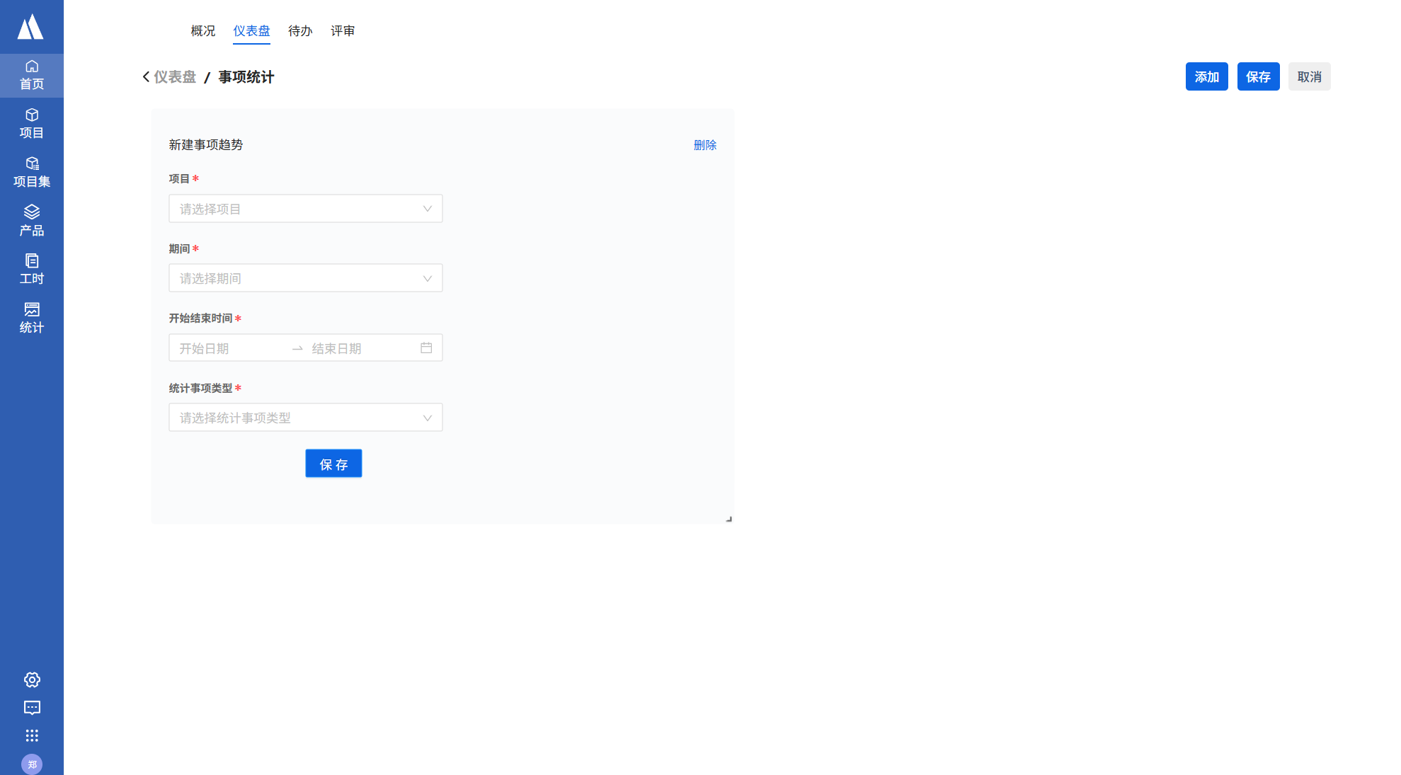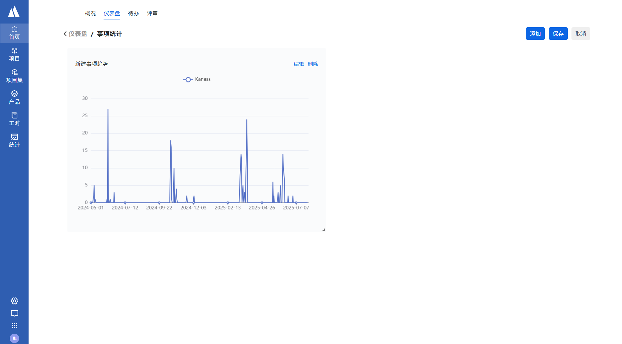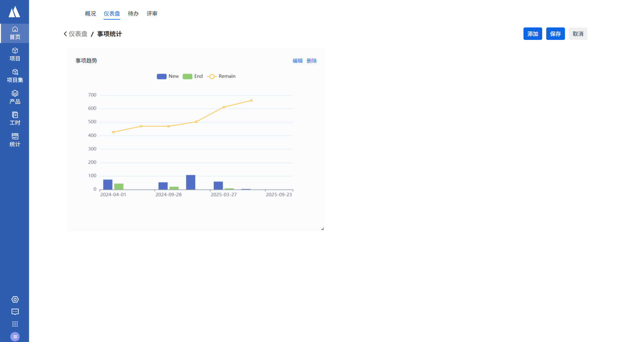 仪表盘页面点击编辑->添加-选择事项tab->新增事项趋势->添加,填写统计要求后点击保存。