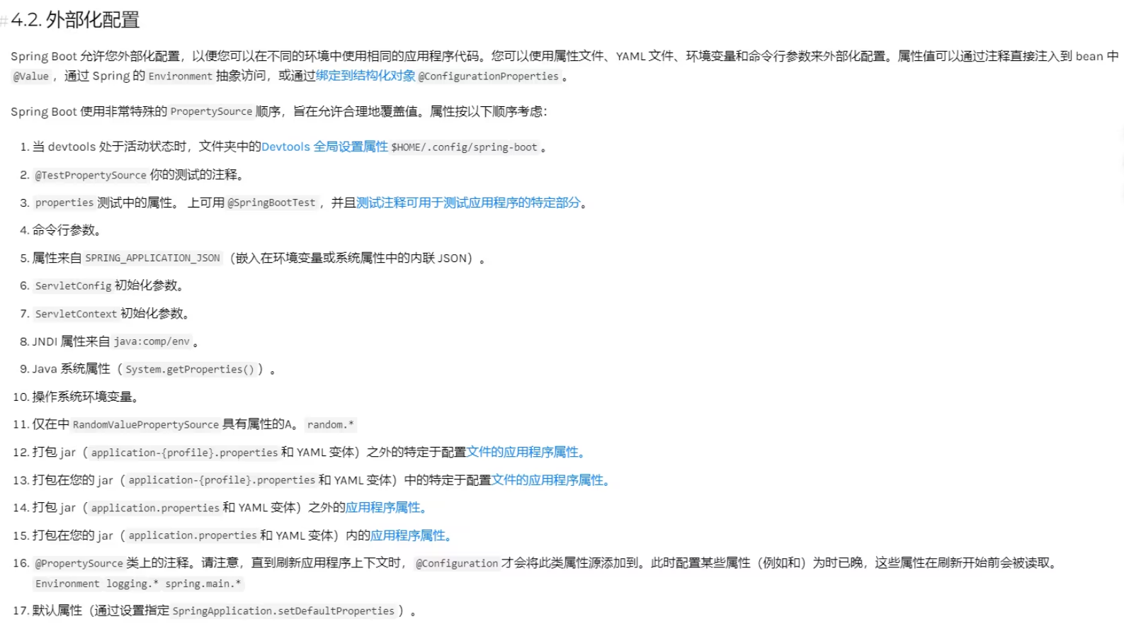 Spring Boot 在启动时加载配置属性的完整优先级顺序可参考如下的官方文档:从上到下,优先级逐渐降低,即下面的配置,同样的参数会被上面的配置所覆盖