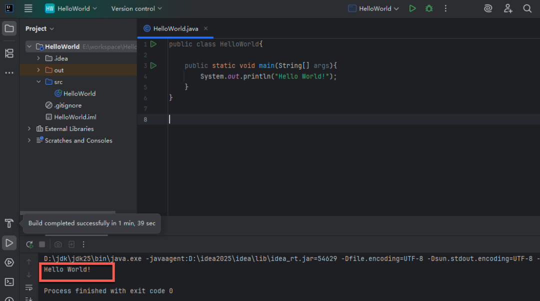 运行结果将在 IDEA 底部的 Run 工具窗口中显示。你应该会看到 Hello, World!
