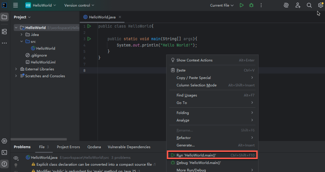 在代码编辑区域内右键点击,选择 Run 'HelloWorld.main()'。