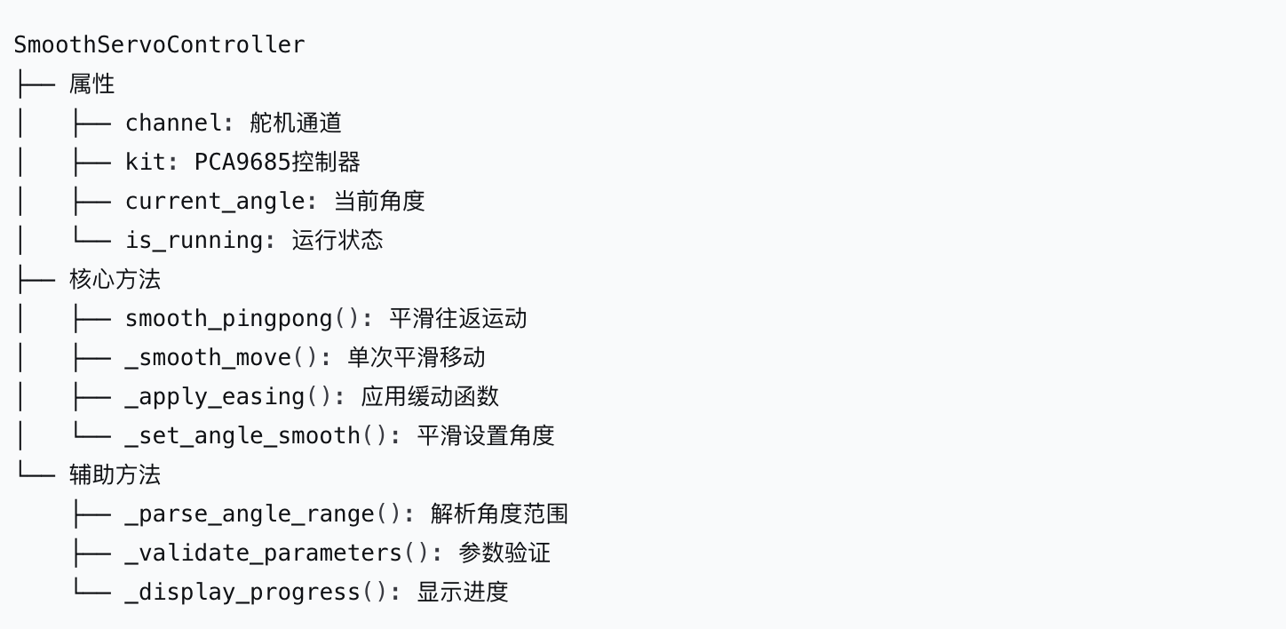 if __name__ == "__main__":print("🚀 平滑舵机控制器启动")try:while True:print("\n" + "=" * 60)print("🏠 主菜单")print("=" * 60)print("1. 基础演示")print("2. 缓动函数对比")print("3. 交互式控制")print("4. 教学示例")print("5. 退出程序")choice = input("请选择功能 (1-5): ").strip()if choice == "1":basic_demo()elif choice == "2":easing_comparison_demo()elif choice == "3":interactive_control()elif choice == "4":educational_examples()elif choice == "5":print("👋 感谢使用平滑舵机控制器!")breakelse:print("❌ 无效选择,请重新输入")except KeyboardInterrupt:print("\n\n👋 程序被用户中断,再见!")except Exception as e:print(f"\n❌ 程序错误: {e}")