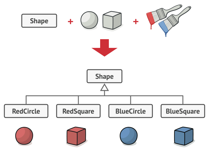 在层次结构中添加新的形状类型和颜色会导致其呈指数级增长。例如,要添加一个三角形形状,你需要引入两个子类,每个颜色一个。之后,添加一种新颜色将需要创建三个子类,每个形状类型一个。越往后,情况越糟糕。