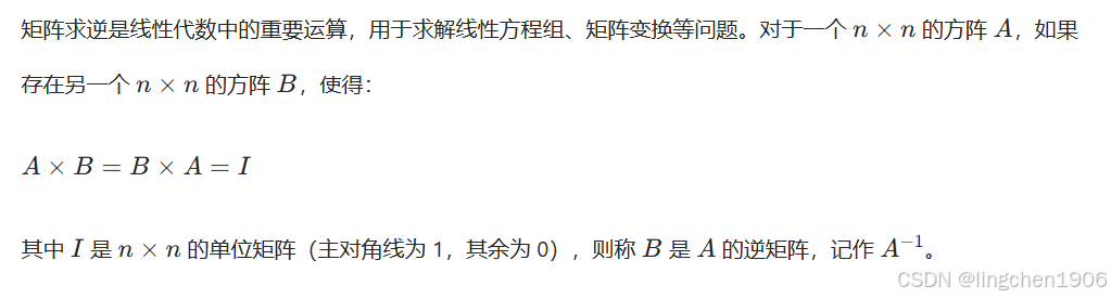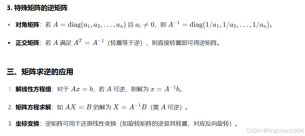 矩阵求逆的核心是找到满足 AA−1=I 的矩阵,常用方法有伴随矩阵法(适合理论推导)和初等行变换法(适合实际计算)。可逆矩阵在工程、物理、计算机科学等领域有广泛应用,是线性代数的基础工具之一。